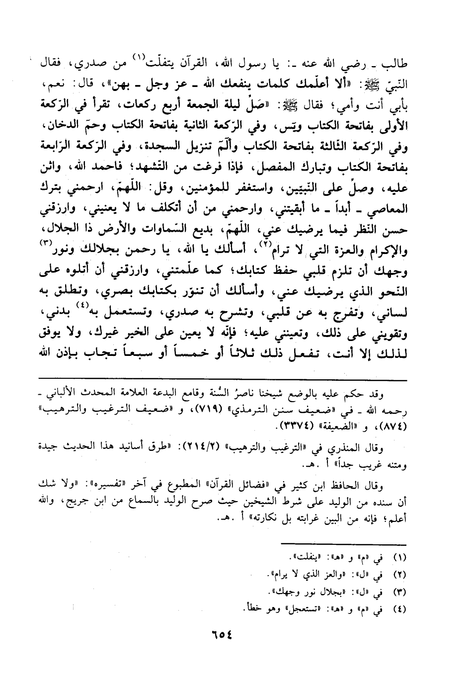 طالب - رضي الله عنه -: يا رسول الله، القرآن يتفلّت (¬1) من صدري، فقال النّبيّ - صلى الله عليه وسلم -: "ألا أعلّمك كلمات ينفعك الله - عَزَّ وَجَلَّ - بهن"، قال: نعم، بأبي أنت وأمي؛ فقال - صلى الله عليه وسلم -: "صَلِّ ليلة الجمعة أربع ركعات، تقرأ في الرّكعة الأولى بفاتحة الكتاب ويس، وفي الرّكعة الثانية بفاتحة الكتاب وحم الدخان، وفي الرّكعة الثالثة بفاتحة الكتاب وألم تنزيل السجدة، وفي الرّكعة الرابعة بفاتحة الكتاب وتبارك المفصل، فإذا فرغت من التّشهد؛ فاحمد الله، واثن عليه، وصلّ على النّبيّين، واستغفر للمؤمنين، وقل: اللهمّ، ارحمني بترك المعاصي -أبدًا- ما أبقيتني، وارحمني من أن أتكلف ما لا يعنيني، وارزقني حسن النّظر فيما يرضيك عني، اللهمّ، بديع السّماوات والأرض ذا الجلال، والإكرام والعزة التي لا ترام (¬2)، أسألك يا الله، يا رحمن بجلالك ونور (¬3) وجهك أن تلزم قلبي حفظ كتابك؛ كما علّمتني، وارزقني أن أتلوه على النّحو الذي يرضيك عني، وأسألك أن تنوّر بكتابك بصري، وتطلق به لساني، وتفرج به عن قلبي، وتشرح به صدري، وتستعمل به (¬4) بدني، وتقويني على ذلك، وتعينني عليه؛ فإنه لا يعين على الخير غيرك، ولا يوفق لذلك إلا أنت، تفعل ذلك ثلاثًا أو خمسًا أو سبعًا تجاب بإذن الله