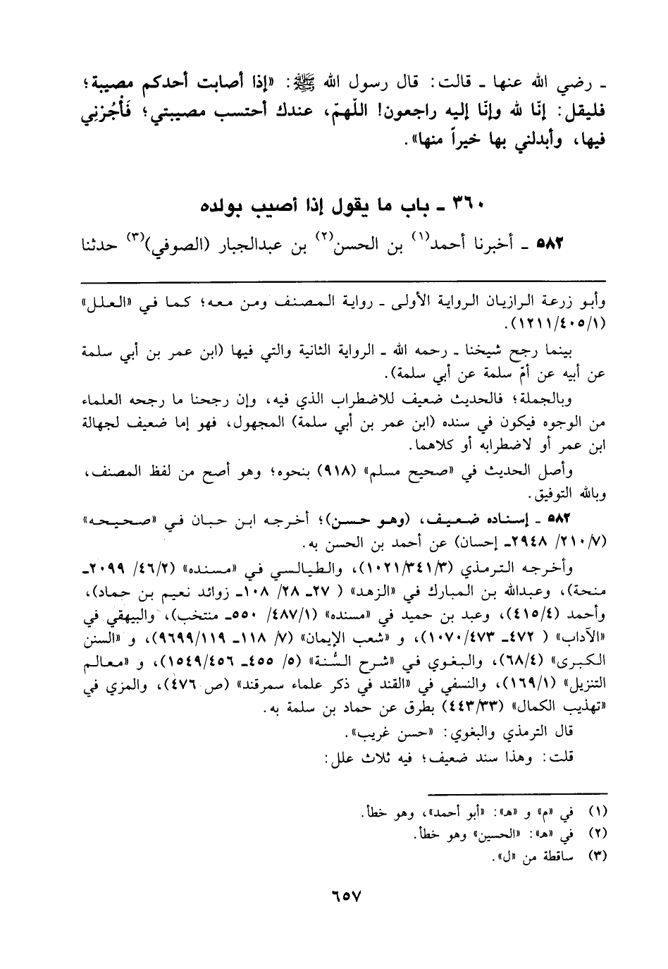 وبالجملة، فالحديث ضعيف للاضطراب الذي فيه، وإن رجحنا ما رجحه العلماء من الوجوه فيكون في سنده (ابن عمر بن أبي سلمة) المجهول، فهو إما ضعيف لجهالة ابن عمر أو لاضطرابه أو كلاهما.