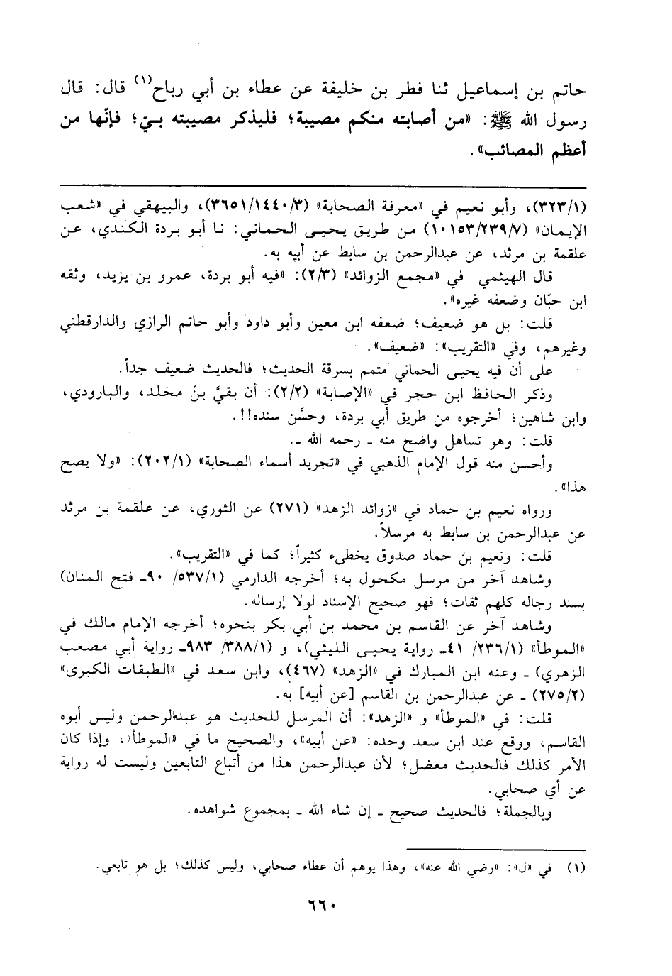 حاتم بن إسماعيل ثنا فطر بن خليفة عن عطاء بن أبي رباح (¬1) قال: قال رسول الله - صلى الله عليه وسلم -: "من أصابته منكم مصيبة؛ فليذكر مصيبته بيّ؛ فإنّها من أعظم المصائب".