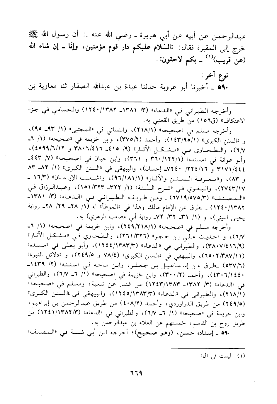 عبد الرحمن عن أبيه عن أبي هريرة - رضي الله عنه -: أن رسول الله - صلى الله عليه وسلم - خرج إلى المقبرة فقال: "السّلام عليكم دار قوم مؤمنين، وإنّا -إن شاء الله (عن قريب) (¬1) - بكم لاحقون".