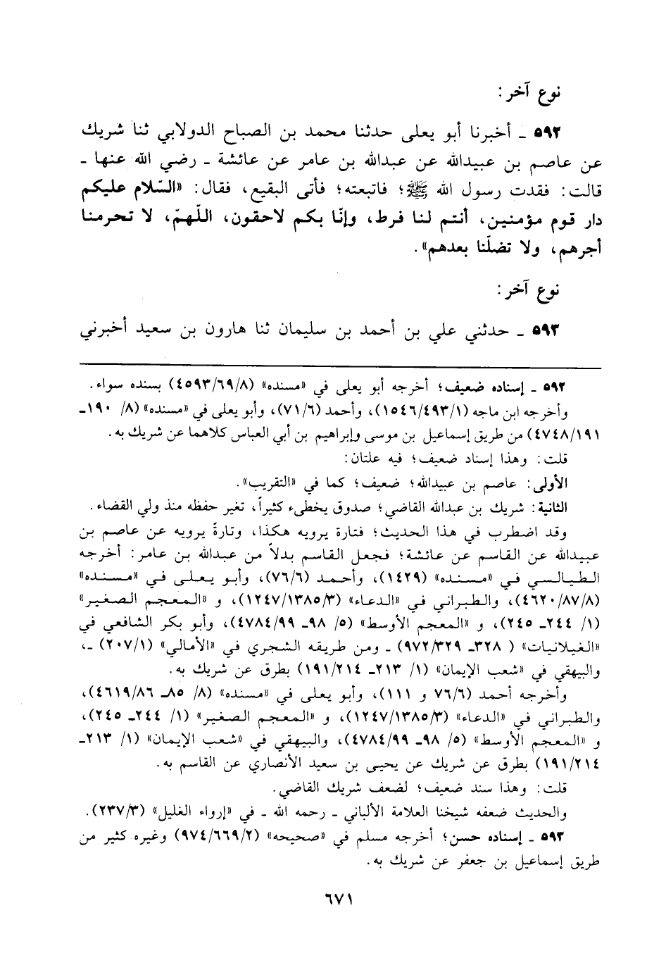 592 - أخبرنا أبو يعلى حدثنا محمد بن الصباح الدولابي ثنا شريك عن عاصم بن عبيد الله عن عبد الله بن عامر عن عائشة - رضي الله عنها - قالت: فقدت رسول الله - صلى الله عليه وسلم -، فاتبعته، فأتى البقيع، فقال: "السّلام عليكم دار قوم مؤمنين، أنتم لنا فرط، وإنّا بكم لاحقون، اللهمّ، لا تحرمنا أجرهم، ولا تضلّنا بعدهم".