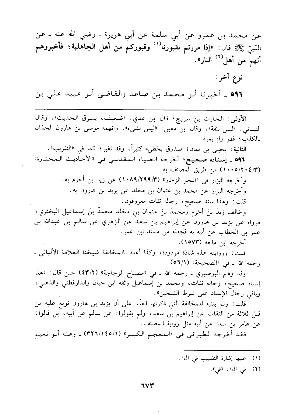 قلت: ولم يتنبه للمخالفة التي ذكرتها آنفًا، على أن يزيد بن هارون توبع عليه من قبل ثلاثة من الثقات عن إبراهيم بن سعد، ولم يقولوا: عن سالم عن أبيه، بل قالوا: عن عامر بن سعد عن أبيه مثل رواية المصنف.