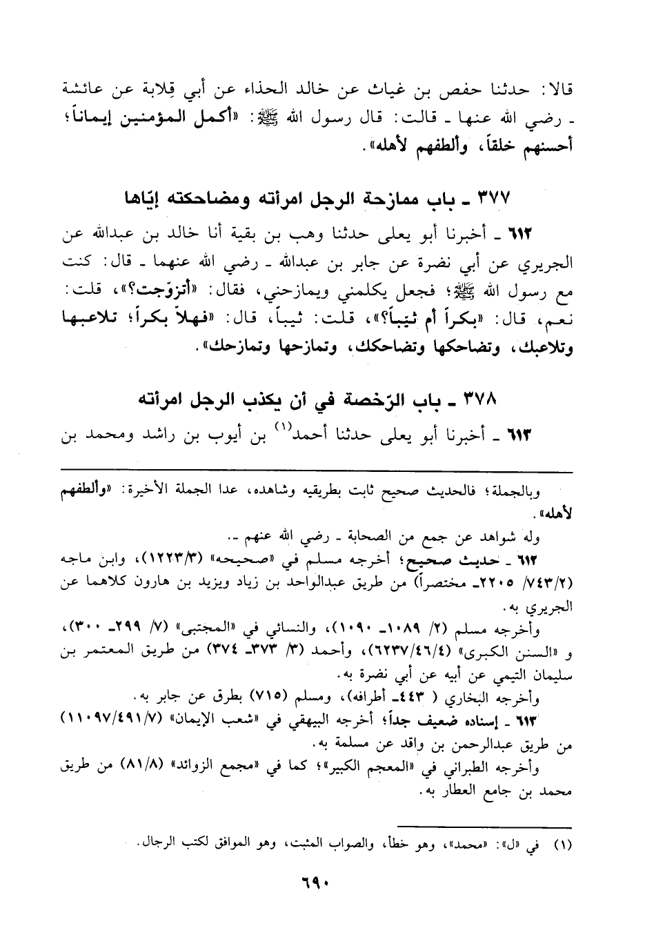612 - أخبرنا أبو يعلى حدثنا وهب بن بقية أنا خالد بن عبد الله عن الجريري عن أبي نضرة عن جابر بن عبد الله - رضي الله عنهما - قال: كنت مع رسول الله - صلى الله عليه وسلم -؛ فجعل يكلمني ويمازحني، فقال: "أتزوّجت؟ "، قلت: نعم، قال: "بكرًا أم ثيبًا؟ "، قلت: ثيبًا، قال: "فهلاّ بكرًا؛ تلاعبها وتلاعبك، وتضاحكها وتضاحكك، وتمازحها وتمازحك".