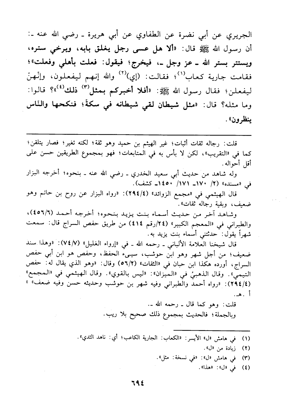 الجريري عن أبي نضرة عن الطفاوي عن أبي هريرة - رضي الله عنه -: أن رسول الله - صلى الله عليه وسلم - قال: "ألا هل عسى رجل يغلق بابه، ويرخي ستره، ويستتر بستر الله - عَزَّ وَجَلَّ -، فيخرج؛ فيقول: فعلت بأهلي وفعلت"؛ فقامت جارية كعاب (¬1)، فقالت: (إي) (¬2) والله إنهم ليفعلون، وإنّهنّ ليفعلن؛ فقال رسول الله - صلى الله عليه وسلم -: "أفلا أخبركم بمثل (¬3) ذلك (¬4) "؟ قالوا: وما مثله؟ قال: "مثل شيطان لقي شيطانه في سكة؛ فنكحها والنّاس ينظرون".