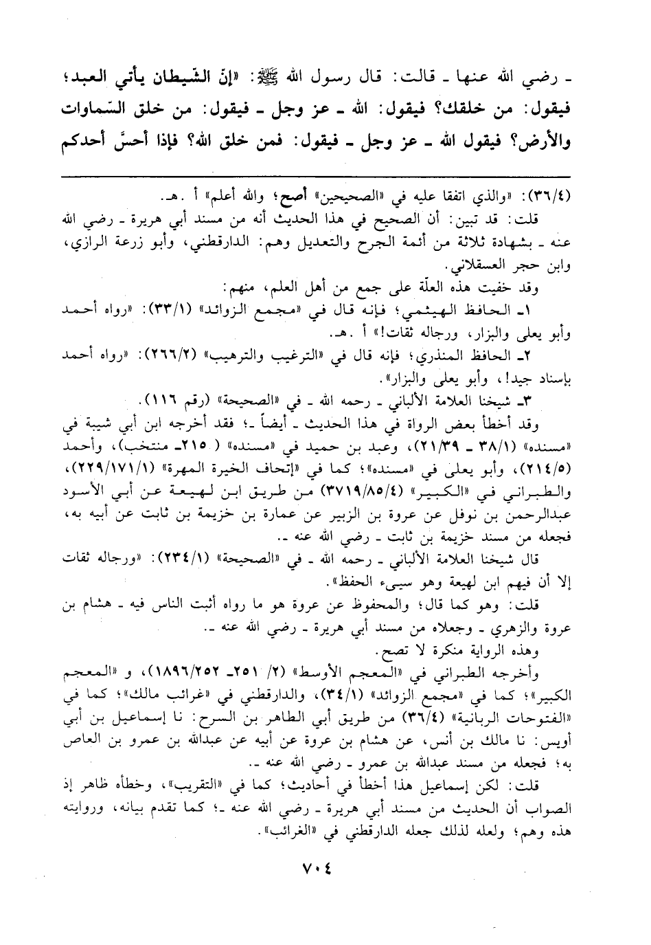 - رضي الله عنها - قالت: قال رسول الله - صلى الله عليه وسلم -: "إن الشيطان يأتي العبد؛ فيقول: من خلقك؟ فيقول: الله - عَزَّ وَجَلَّ - فيقول: من خلق السّماوات والأرض؟ فيقول الله - عَزَّ وَجَلَّ - فيقول: فمن خلق الله؟ فإذا أحسَّ أحدكم