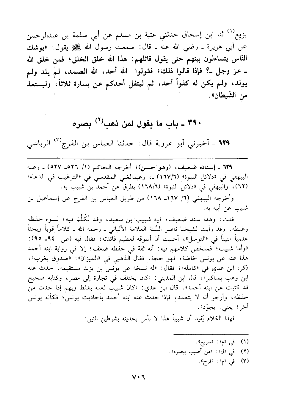 قلت: وهذا سند ضعيف؛ فيه شبيب بن سعيد، وقد تُكُلِّمَ فيه؛ لسوء حفظه وغلطه، وقد رأيت لشيخنا ناصر السُّنة العلامة الألباني - رحمه الله - كلامًا قويًا وبحثًا علميًا متينًا في "التوسل"، أحببت أن أسوقه لعظيم فائدته؛ فقال فيه (ص 94 - 95): "وأما شبيب؛ فملخص كلامهم فيه: أنه ثقة في حفظه ضعف؛ إلا في رواية ابنه أحمد هذا عنه عن يونس خاصّة؛ فهو حجة، فقال الذهبي في "الميزان": "صدوق يغرب"، ذكره ابن عدي في "كامله"؛ فقال: "له نسخة عن يونس بن يزيد مستقيمة، حدث عنه ابن وهب بمناكير"، قال ابن المديني: "كان يختلف في تجارة إلى مصر، وكتابه صحيح قد كتبت عن ابنه أحمد"، قال ابن عدي: "كان شبيب لعله يغلط ويهم إذا حدث من حفظه، وأرجو أنه لا يتعمد، فإذا حدث عنه ابنه أحمد بأحاديث يونس؛ فكأنه يونس آخر، يعني: يجوّد".