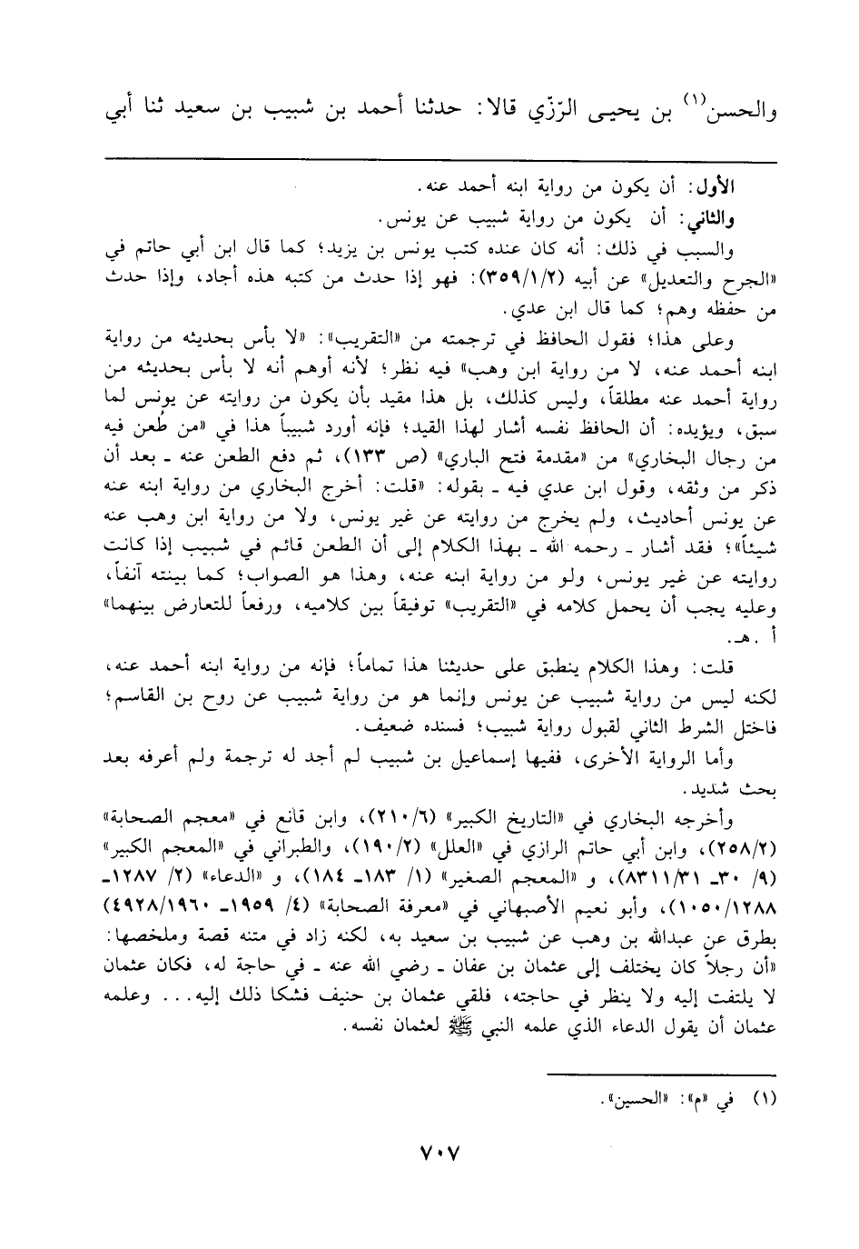 وعلى هذا؛ فقول الحافظ في ترجمته من "التقريب": "لا بأس بحديثه من رواية ابنه أحمد عنه، لا من رواية ابن وهب" فيه نظر؛ لأنه أوهم أنه لا بأس بحديثه من رواية أحمد عنه مطلقًا، وليس كذلك، بل هذا مقيد بأن يكون من روايته عن يونس لما سبق، ويؤيده: أن الحافظ نفسه أشار لهذا القيد؛ فإنه أورد شبيبًا هذا في "من طعن فيه من رجال البخاري" من "مقدمة فتح الباري" (ص 133)، ثم دفع الطعن عنه -بعد أن ذكر من وثقه، وقول ابن عدي فيه- بقوله: "قلت: أخرج البخاري من رواية ابنه عنه عن يونس أحاديث، ولم يخرج من روايته عن غير يونس، ولا من رواية ابن وهب عنه شيئًا"، فقد أشار - رحمه الله - بهذا الكلام إلى أن الطعن قائم في شبيب إذا كانت روايته عن غير يونس، ولو من رواية ابنه عنه، وهذا هو الصواب، كما بينته آنفًا، وعليه يجب أن يحمل كلامه في "التقريب" توفيقًا بين كلاميه، ورفعًا للتعارض بينهما" أ. هـ.