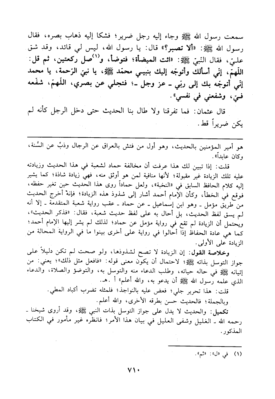 تكميل: والحديث لا يدل على جواز التوسل بذات النّبيّ - صلى الله عليه وسلم -، وقد أروى شيخنا - رحمه الله - الغليل وشفى العليل في بيان هذا الأمر، فانظره غير مأمور في الكتاب المذكور.