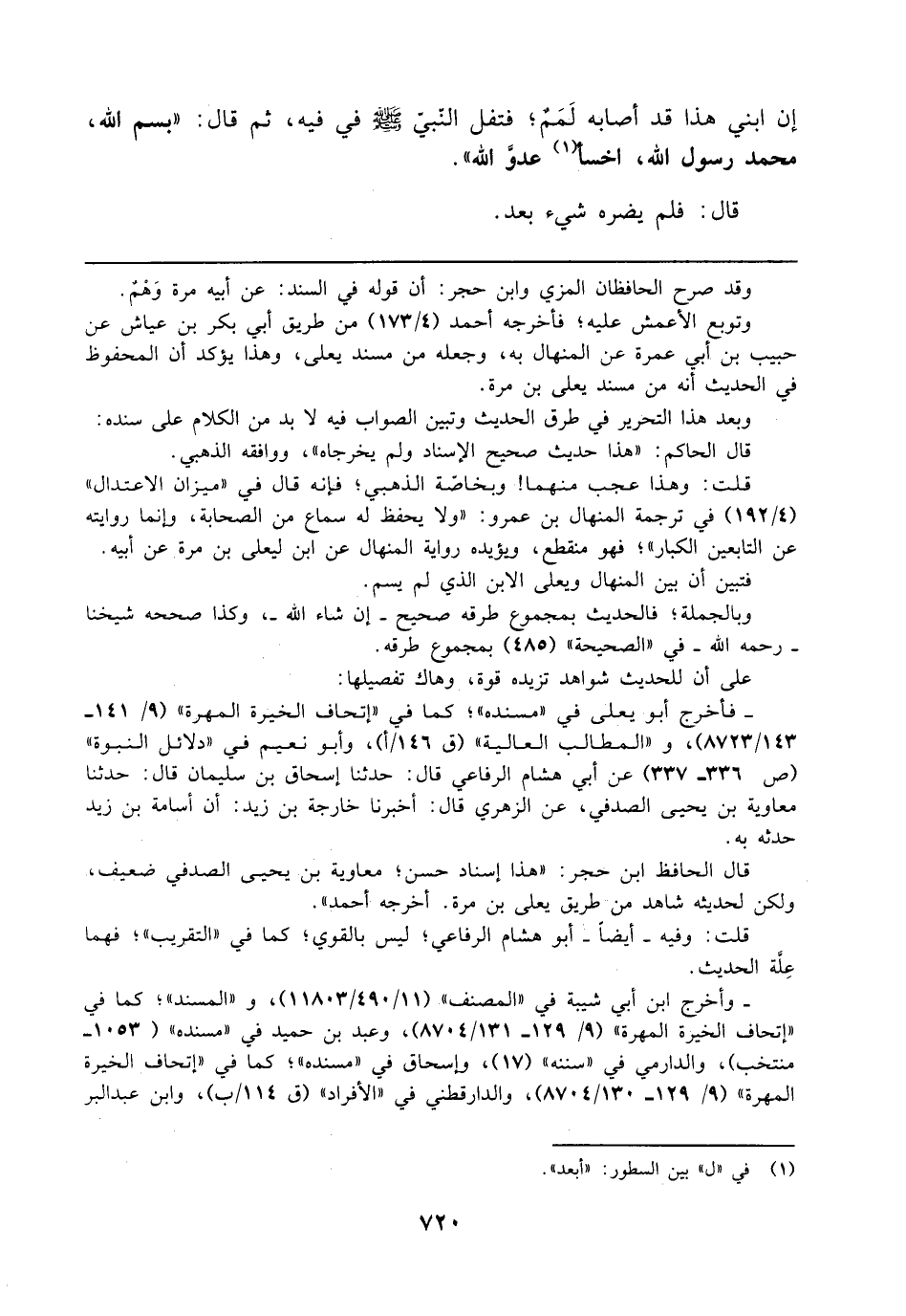 قلت: وهذا عجيب منهما! وبخاصّة الذهبي؛ فإنه قال في "ميزان الاعتدال" (4/ 192) في ترجمة المنهال بن عمرو: "ولا يحفظ له سماع من الصحابة، وإنما روايته عن التابعين الكبار"؛ فهو منقطع، ويؤيده رواية المنهال عن ابن ليعلي بن مرة عن أبيه.