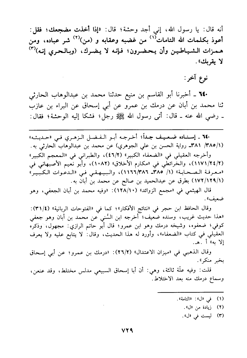 640 - أخبرنا أبو القاسم بن منيع حدثنا محمد بن عبد الوهاب الحارثي ثنا محمد بن أبان عن درمك بن عمرو عن أبي إسحاق عن البراء بن عازب - رضي الله عنه - قال: أتى رسول الله - صلى الله عليه وسلم - رجل؛ فشكا إليه الوحشة؛ فقال: