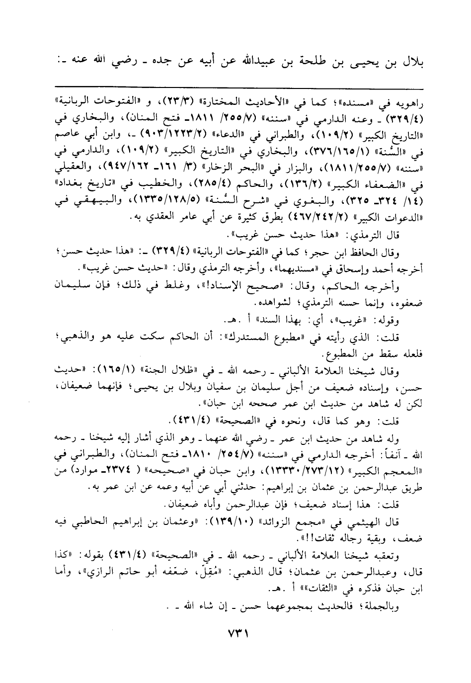 وتعقبه شيخنا العلامة الألباني - رحمه الله - في "الصحيحة" (4/ 431) بقوله: "كذا قال، وعبد الرحمن بن عثمان، قال الذهبي: "مُقِلّ، ضعّفه أبو حاتم الرازي"، وأما ابن حبان فذكره في "الثقات"" أ. هـ.