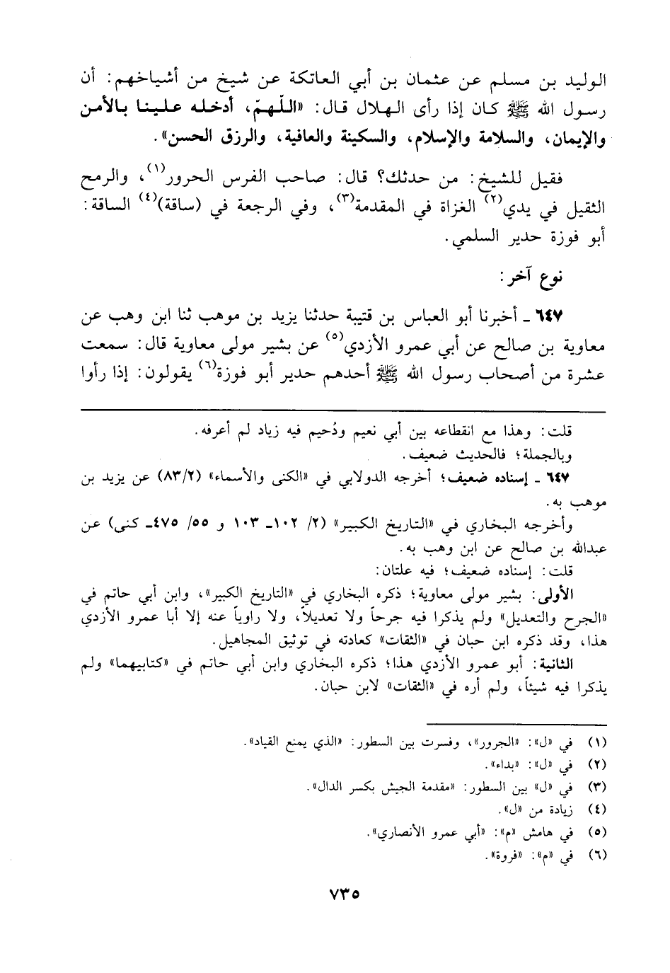 الوليد بن مسلم عن عثمان بن أبي العاتكة عن شيخ من أشياخهم: أن رسول الله - صلى الله عليه وسلم - كان إذا رأى الهلال قال: "اللهمّ، أدخله علينا بالأمن والإيمان, والسلامة والإسلام، والسكينة والعافية، والرزق الحسن".
