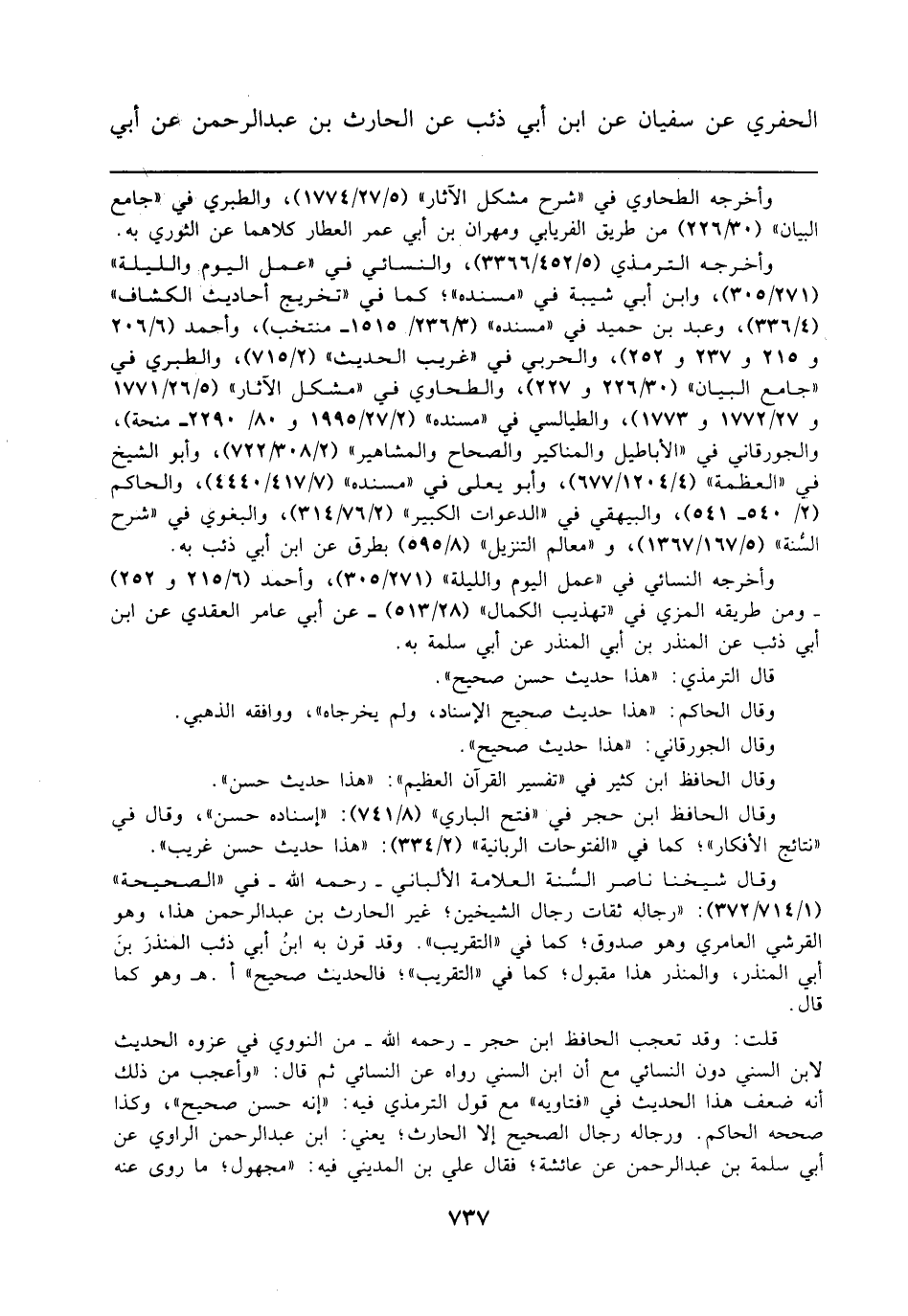 قلت: وقد تعجب الحافظ ابن حجر - رحمه الله - من النووي في عزوه الحديث لابن السني دون النسائي مع أن ابن السني رواه عن النسائي ثم قال: "وأعجب من ذلك أنه ضعف هذا الحديث في "فتاويه" مع قول الترمذي فيه: "إنه حسن صحيح"، وكذا صححه الحاكم. ورجاله رجال الصحيح إلا الحارث؛ يعني: ابن عبد الرحمن الراوي عن أبي سلمة بن عبد الرحمن عن عائشة، فقال علي بن المديني فيه: "مجهول؛ ما روى عنه