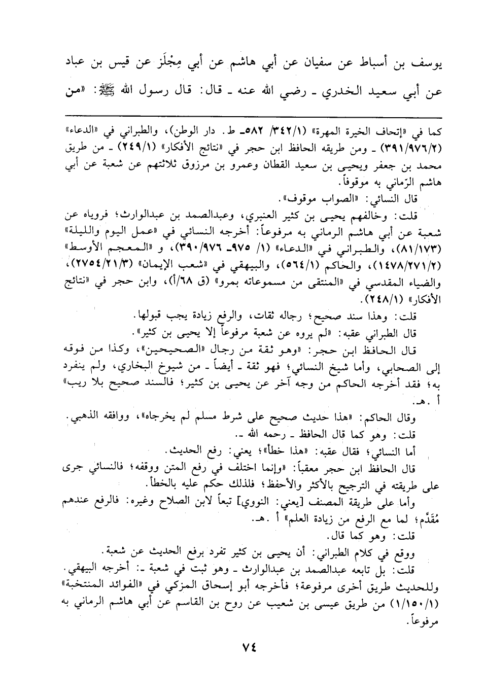 قلت: وخالفهم يحيى بن كثير العنبري، وعبد الصمد بن عبد الوارث؛ فروياه عن شعبة عن أبي هاشم الرماني به مرفوعًا: أخرجه النسائي في "عمل اليوم والليلة" (173/ 81)، والطبراني في "الدعاء" (1/ 975 - 976/ 390)، و "المعجم الأوسط" (2/ 271 / 1478)، والحاكم (1/ 564)، والبيهقي في "شعب الإيمان" (3/ 21/ 2754)، والضياء المقدسي في "المنتقى من مسموعاته بمرو" (ق 68/أ)، وابن حجر في "نتائج الأفكار" (1/ 248).