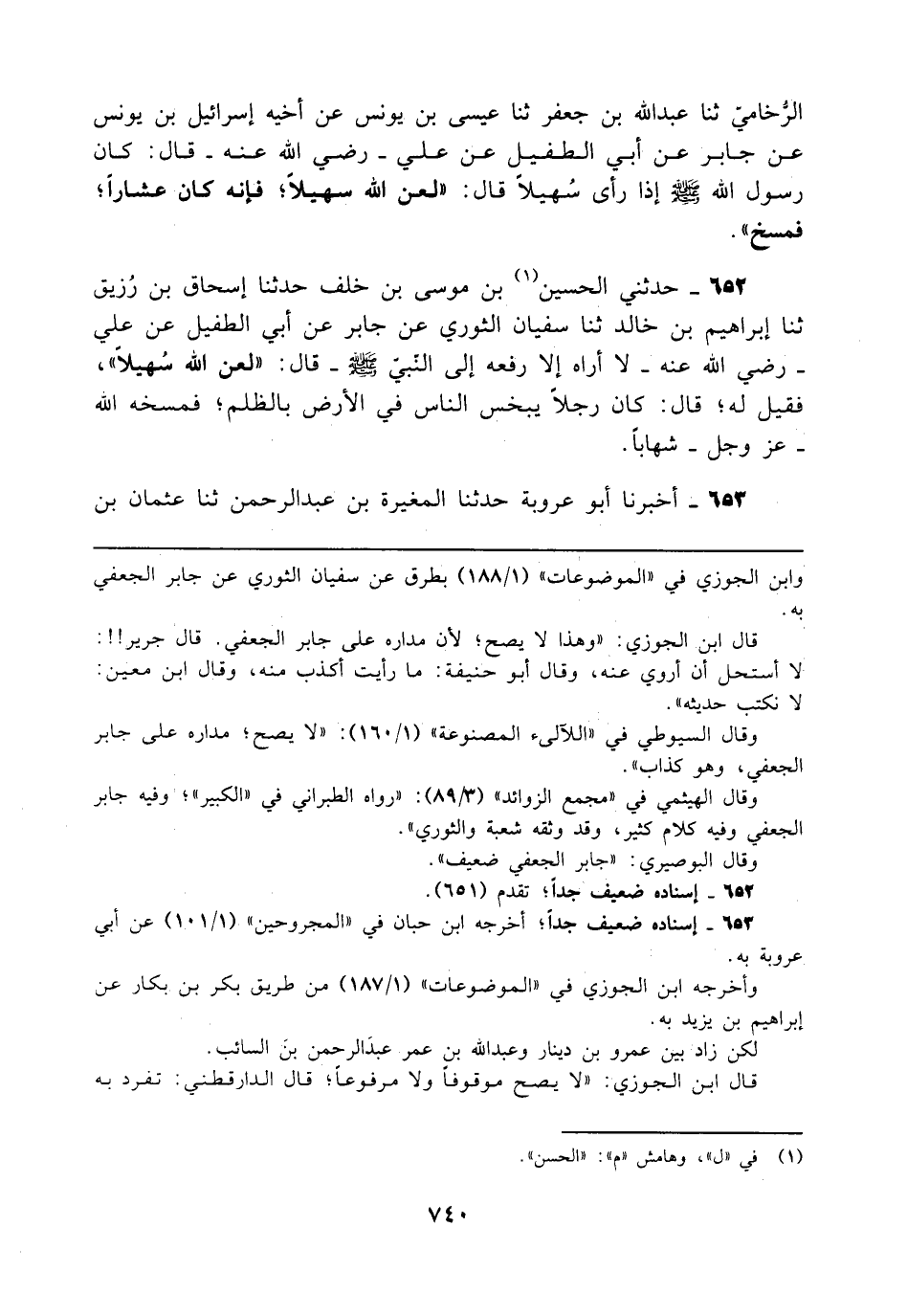 652 - حدثني الحسين (¬1) بن موسى بن خلف حدثنا إسحاق بن رُزيق ثنا إبراهيم بن خالد ثنا سفيان الثوري عن جابر عن أبي الطفيل عن علي - رضي الله عنه - لا أراه إلا رفعه إلى النّبيّ - صلى الله عليه وسلم - قال: "لعن الله سُهيلًا"، فقيل له؛ قال: كان رجلًا يبخس الناس في الأرض بالظلم؛ فمسخه الله - عَزَّ وَجَلَّ - شهابًا.