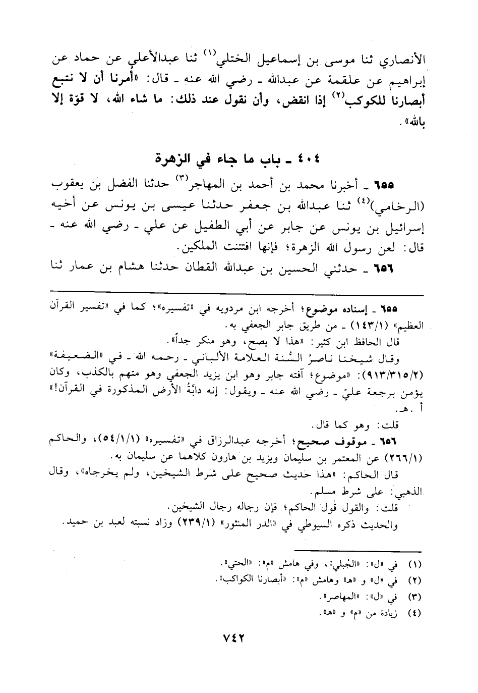 الأنصاري ثنا موسى بن إسماعيل الختلي (¬1) ثنا عبد الأعلى عن حماد عن إبراهيم عن علقمة عن عبد الله - رضي الله عنه - قال: " أُمرنا أن لا نتبع أبصارنا للكوكب (¬2) إذا انقض، وأن نقول عند ذلك: ما شاء الله، لا قوّة إلا بالله".