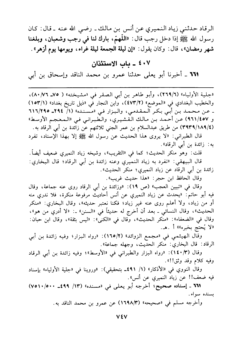 وقال في "تبيين العجب" (ص 19): "وزائدة بن أبي الرقاد روى عنه جماعة، وقال فيه أبو حاتم: "يحدث عن زياد النميري عن أنس أحاديث مرفوعة منكرة، فلا ندري منه أو من زياد، ولا أعلم روى عنه غير زياد؛ فكنا نعتبر حديثه"، وقال البخاري: "منكر الحديث"، وقال النسائي -بعد أن أخرج له حديثًا في "السنن"-: "لا أدري من هو"، وقال في "الضعفاء": "منكر الحديث"، وقال في "الكنى": "ليس بثقة"، وقال ابن حبان: "لا يُحتج بخبره"" أ. هـ.