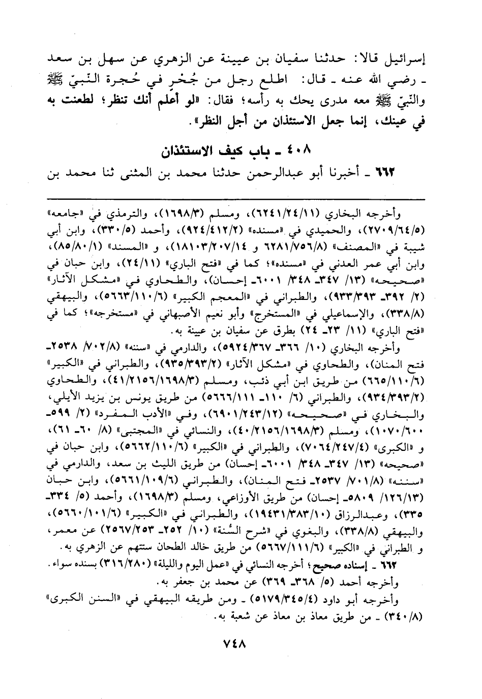 إسرائيل قالا: حدثنا سفيان بن عيينة عن الزهري عن سهل بن سعد - رضي الله عنه - قال: اطلع رجل من جُحْرٍ في حُجرة النّبيّ - صلى الله عليه وسلم - والنّبيّ - صلى الله عليه وسلم - معه مدرى يحك به رأسه؛ فقال: "لو أعلم أنك تنظر؛ لطعنت به في عينك، إنما جعل الاستئذان من أجل النظر".