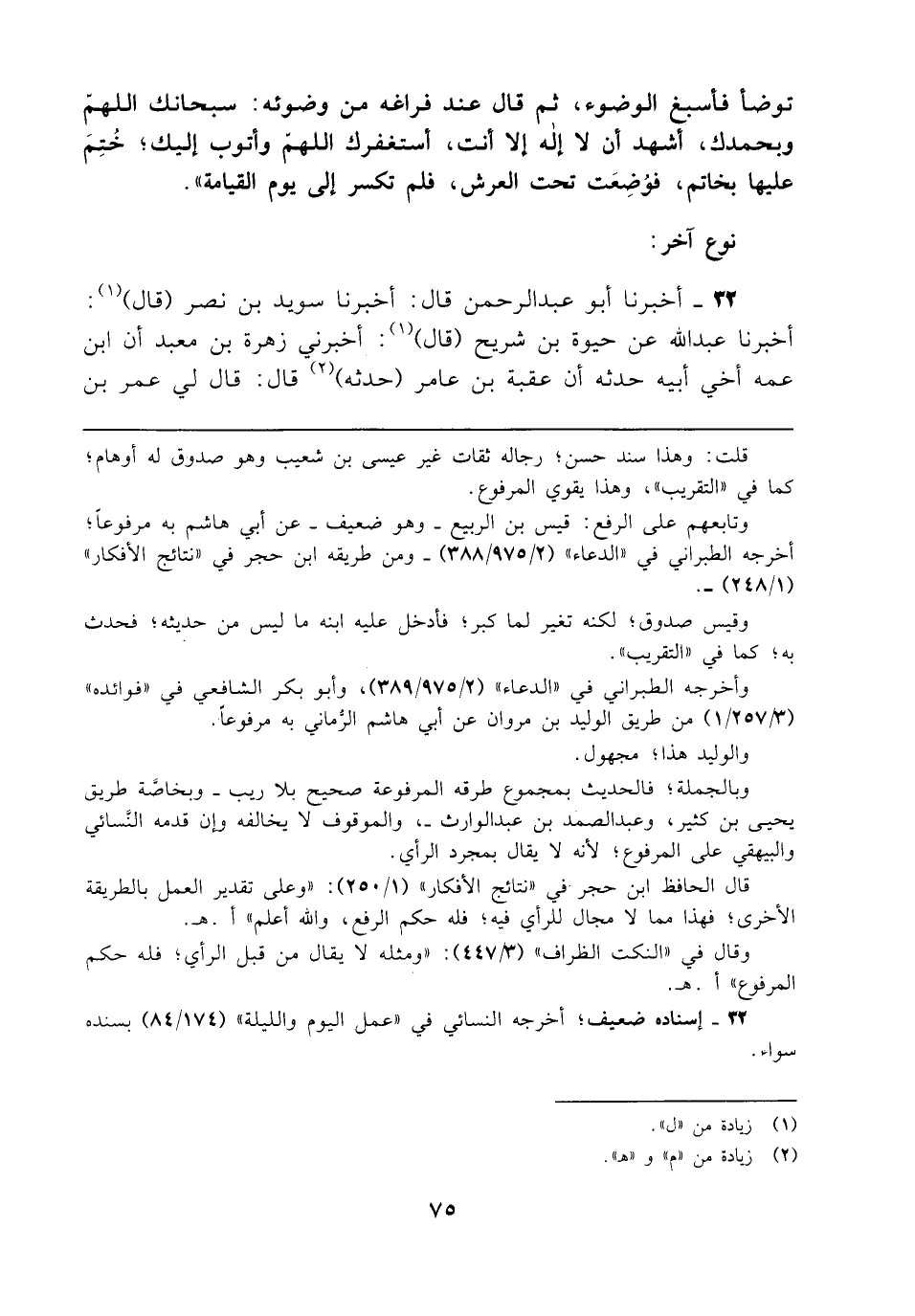 توضأ فأسبغ الوضوء، ثم قال عند فراغه من وضوئه: سبحانك اللهمّ وبحمدك، أشهد أن لا إله إلا أنت، أستغفرك اللهمّ وأتوب إليك؛ خُتِمَ عليها بخاتم، فوُضِعَت تحت العرش، فلم تكسر إلى يوم القيامة".