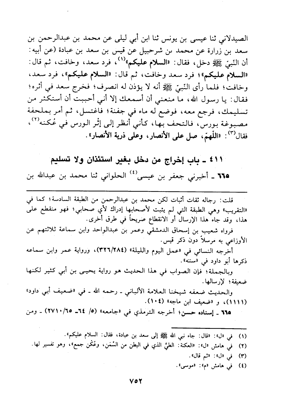 الصيدلاني ثنا عيسى بن يونس ثنا ابن أبي ليلى عن محمَّد بن عبد الرحمن بن سعد بن زرارة عن محمَّد بن شرحبيل عن قيس بن سعد بن عبادة (عن أبيه: أن النبي - صلى الله عليه وسلم - دخل، فقال: "السلام عليكم" (¬1)، فرد سعد، وخافت، ثم قال: "السلام عليكم"؛ فرد سعد وخافت، ثم قال: "السلام عليكم"، فرد سعد، وخافت؛ فلما رأى النبي - صلى الله عليه وسلم - أنه لا يؤذن له انصرف؛ فخرج سعد في أثره؛ فقال: يا رسول الله، ما منعني أن أسمعك إلا أني أحببت أن أستكثر من تسليمك، فرجع معه، فوضع له ماء في جفنة؛ فاغتسل، ثم أمر بملحفة مصبوغة بورس، فالتحف بها، كأني انظر إلى إثر الورس في عُكنه (¬2)، فقال (¬3): "اللهمّ، صل على الأنصار، وعلى ذرية الأنصار".