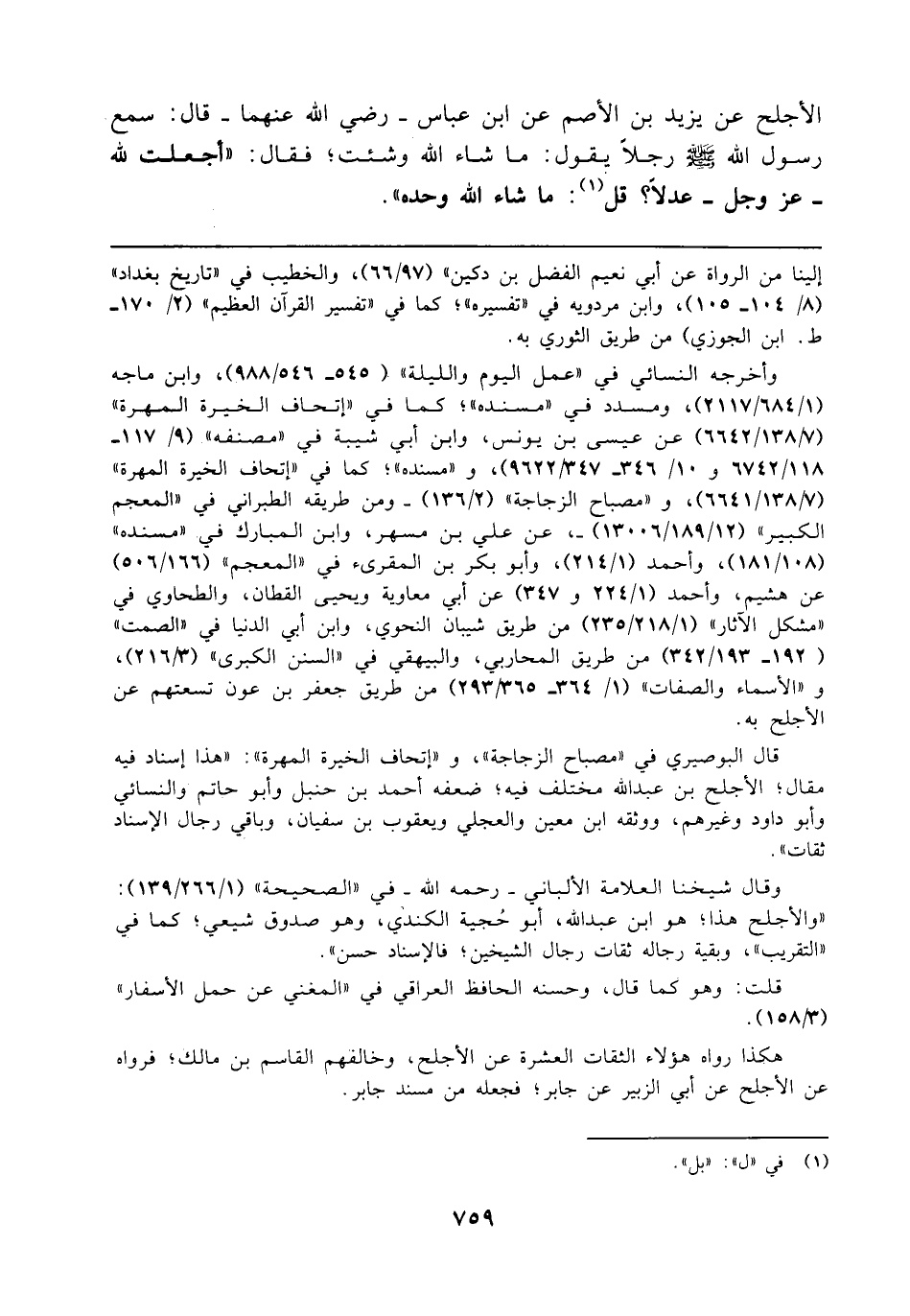 وأخرجه النسائي في "عمل اليوم والليلة" (545 - 546/ 988)، وابن ماجه (1/ 684/ 2117)، ومسدد في "مسنده"؛ كما في "إتحاف الخيرة المهرة" (7/ 138/ 6642) عن عيسى بن يونس، وابن أبي شيبة في "مصفه" (9/ 117 - 118/ 6742 و 10/ 346 - 347/ 9622)، و"مسنده"؛ كما في "إتحاف الخيرة المهرة" (7/ 138/ 6641)، و"مصباح الزجاجة" (2/ 136) -ومن طريقه الطبراني في "المعجم الكبير" (12/ 189/ 13006) -، عن علي بن مسهر، وابن المبارك في "مسنده" (108/ 181)، وأحمد (1/ 214)، وأبو بكر بن المقرئ في "المعجم" (166/ 506) عن هشيم، وأحمد (1/ 224 و 347) عن أبي معاوية ويحيى القطان، والطحاوي في "مشكل الآثار" (1/ 218/ 235) من طريق شيبان النحوي، وابن أبي الدنيا في "الصمت" (192 - 193/ 342) من طريق المحاربي، والبيهقي في "السنن الكبرى" (3/ 216)، و"الأسماء والصفات" (1/ 364 - 365/ 293) من طريق جعفر بن عون تسعتهم عن الأجلح به.