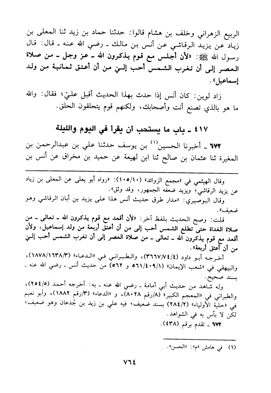 الربيع الزهراني وخلف بن هشام قالوا: حدثنا حماد بن زيد ثنا المعلي بن زياد عن يزيد الرقاشي عن أنس بن مالك - رضي الله عنه - قال: قال رسول الله - صلى الله عليه وسلم -: "لأن أجلس مع قوم يذكرون الله - عَزَّ وَجَلَّ - من صلاة العصر إلى أن تغرب الشمس أحب إلي من أن أعتق ثمانية من ولد إسماعيل".