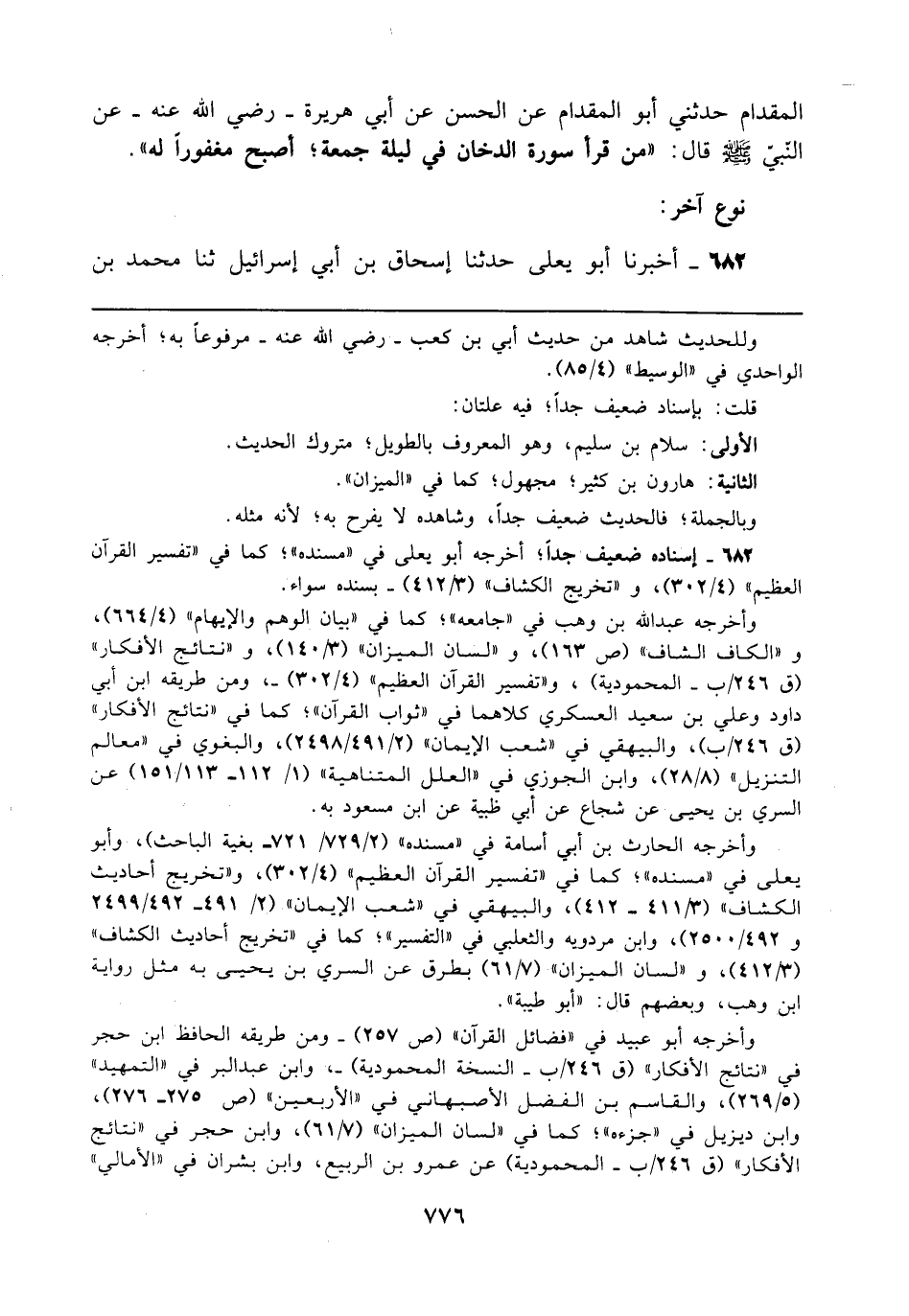 المقدام حدثني أبو المقدام عن الحسن عن أبي هريرة - رضي الله عنه - عن النبي - صلى الله عليه وسلم - قال: "من قرأ سورة الدخان في ليلة جمعة؛ أصبح مغفورًا له".