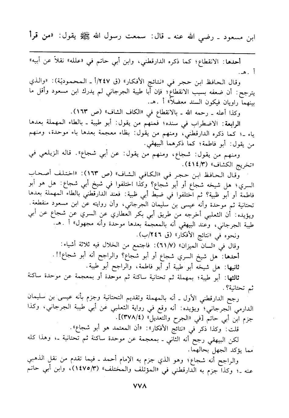 وقال الحافظ ابن حجر في "نتائج الأفكار" (ق 247/أ - المحمودية): "والذي يترجح: أن ضعفه بسبب الانقطاع، فإن أبا طيبة الجرحاني لم يدرك ابن مسعود وأقل ما بينهما راويان فيكون السند معضلا" أ. هـ.