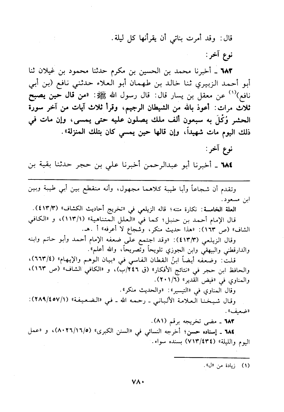 683 - أخبرنا محمَّد بن الحسين بن مكرم حدثنا محمود بن غيلان ثنا أبو أحمد الزبيري ثنا خالد بن طهمان أبو العلاء حدثني نافع (بن أبي نافع) (¬1) عن معقل بن يسار قال: قال رسول الله - صلى الله عليه وسلم -: "من قال حين يصبح ثلاث مرات: أعوذ بالله من الشيطان الرجيم، وقرأ ثلاث آيات من آخر سورة الحشر وُكِّلَ به سبعون ألف ملك يصلون عليه حتى يمسى، وإن مات في ذلك اليوم مات شهيدًا، وإن قالها حين يمسي كان بتلك المنزلة".