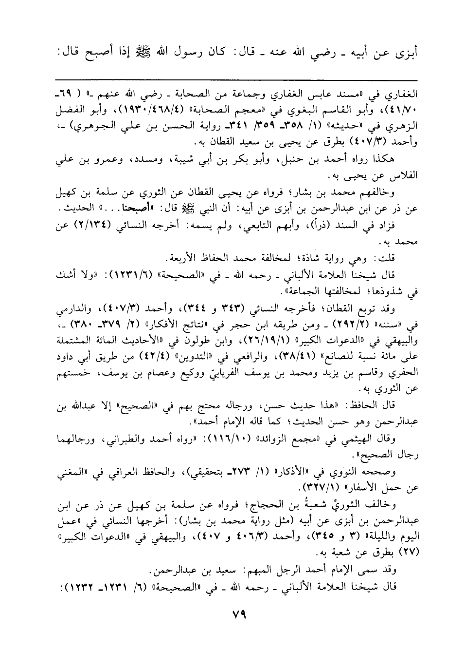وخالف الثوريَّ شعبةُ بن الحجاج؛ فرواه عن سلمة بن كهيل عن ذر عن ابن عبد الرحمن بن أبزى عن أبيه (مثل رواية محمد بن بشار): أخرجها النسائي في "عمل اليوم والليلة" (3 و 345)، وأحمد (3/ 406 و 407)، والبيهقي في "الدعوات الكبير" (27) بطرق عن شعبة به.