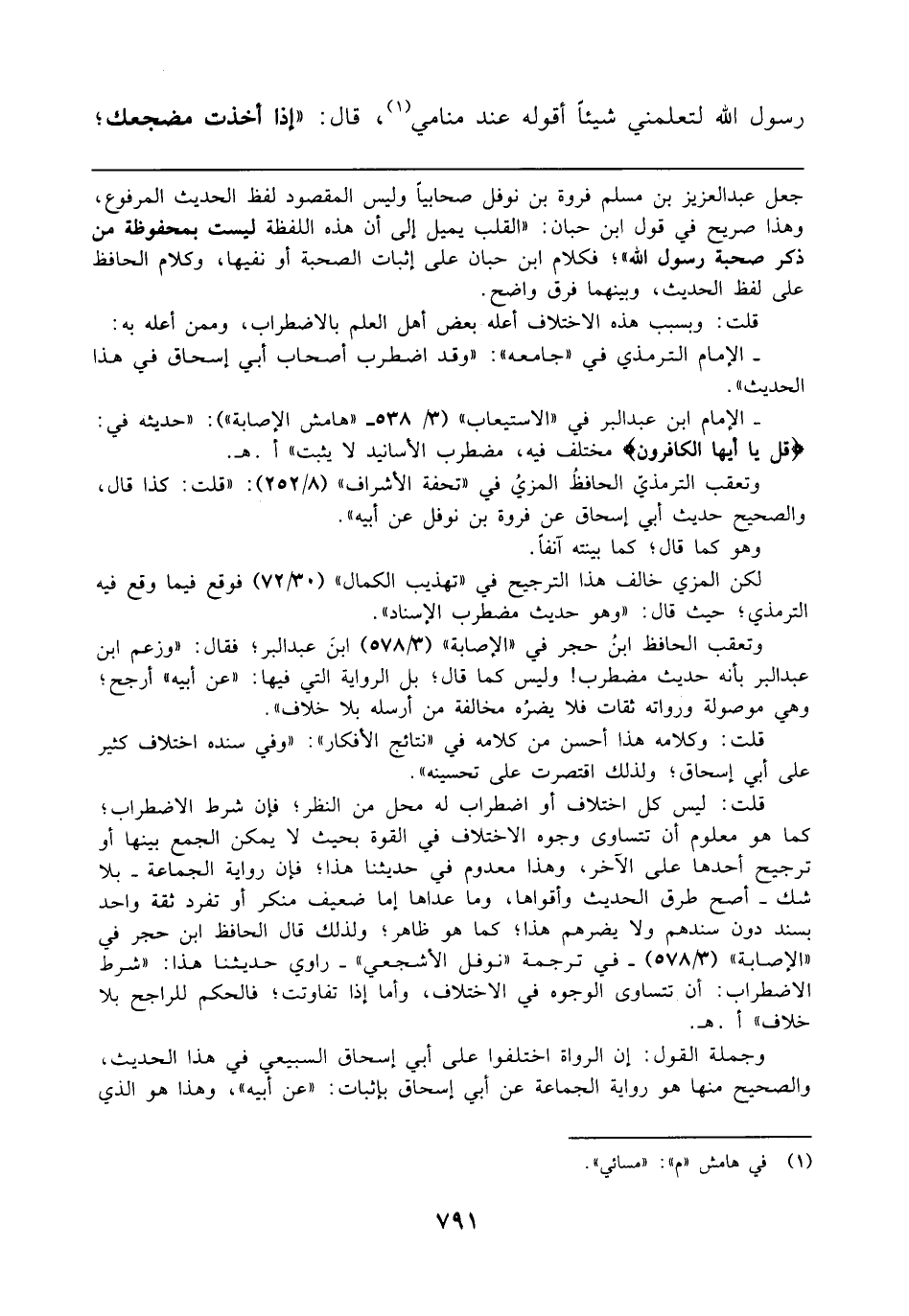 قلت: ليس كل اختلاف أو اضطراب له محل من النظرة فإن شرط الاضطراب؛ كما هو معلوم أن تتساوى وجوه الاختلاف في القوة بحيث لا يمكن الجمع بينها أو ترجيح أحدها على الآخر، وهذا معدوم في حديثنا هذا، فإن رواية الجماعة -بلا شك- أصح طرق الحديث وأقواها، وما عداها إما ضعيف منكر أو تفرد ثقة واحد بسند دون سندهم ولا يضرهم هذا؛ كما هو ظاهر؛ ولذلك قال الحافظ ابن حجر في "الإصابة" (3/ 578) -في ترجمة "نوفل الأشجعي"- راوي حديثنا هذا: "شرط الاضطراب: أن تتساوى الوجوه في الاختلاف، وأما إذا تفاوتت؛ فالحكم للراجح بلا خلاف" أ. هـ.