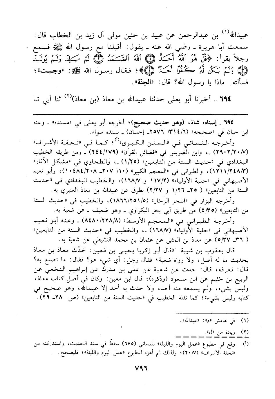 694 - أخبرنا أبو يعلى حدثنا عبيد الله بن معاذ (بن معاذ) (¬2) ثنا أبي ثنا