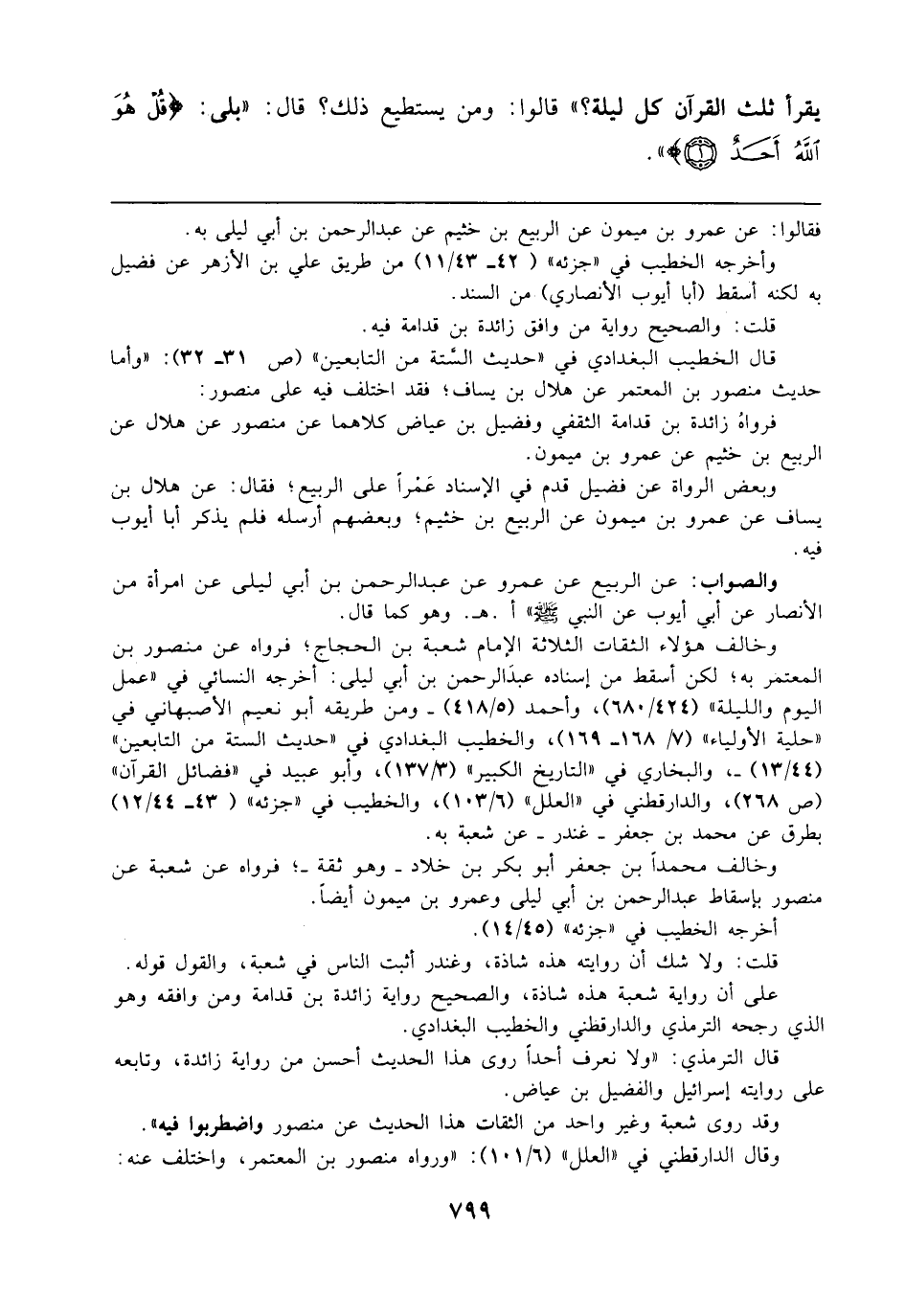 على أن رواية شعبة هذه شاذة، والصحيح رواية زائدة بن قدامة ومن وافقه وهو الذي رجحه الترمذي والدارقطني والخطيب البغدادي.