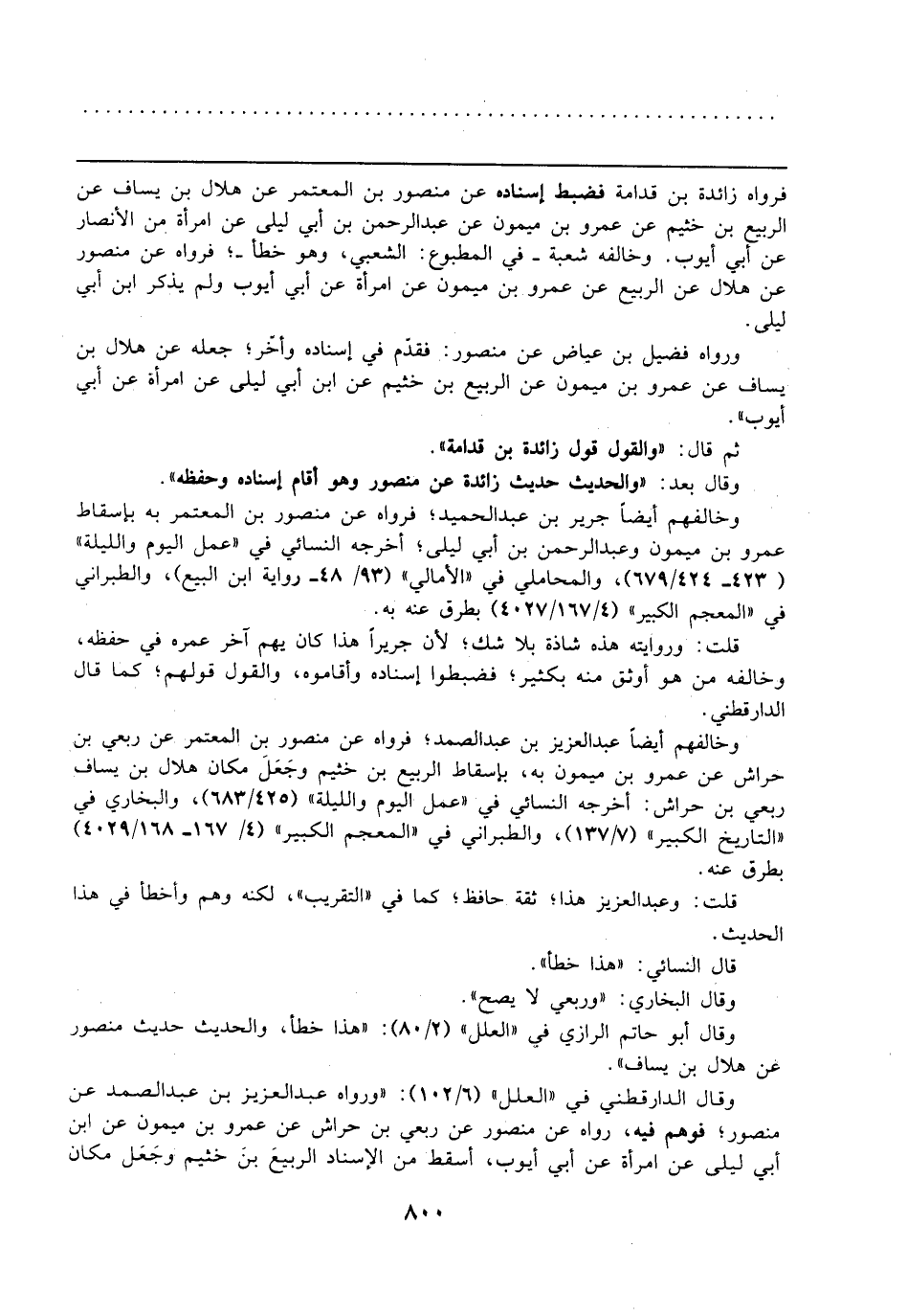 وقال الدارقطني في "العلل" (6/ 102): "ورواه عبد العزيز بن عبد الصمد عن منصورة فوهم فيه، رواه عن منصور عن ربعي بن حراش عن عمرو بن ميمون عن ابن أبي ليلى عن امرأة عن أبي أيوب، أسقط من الإسناد الربيعَ بنَ خثيم وجَعَل مكان