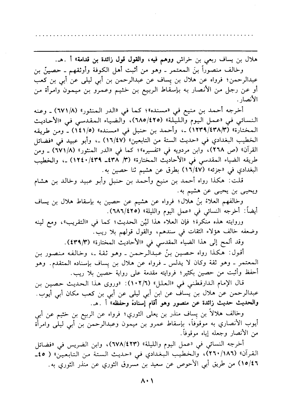 وخالف منصورًا بنَ المعتمر -وهو من أثبت أهل الكوفة وأوثقهم- حصين بن عبد الرحمن؛ فرواه عن هلال بن يِساف عن عبد الرحمن بن أبي ليلى عن أبي بن كعب أو عن رجل من الأنصار به بإسقاط الربيع بن خثيم وعمرو بن ميمون وامرأة من الأنصار.