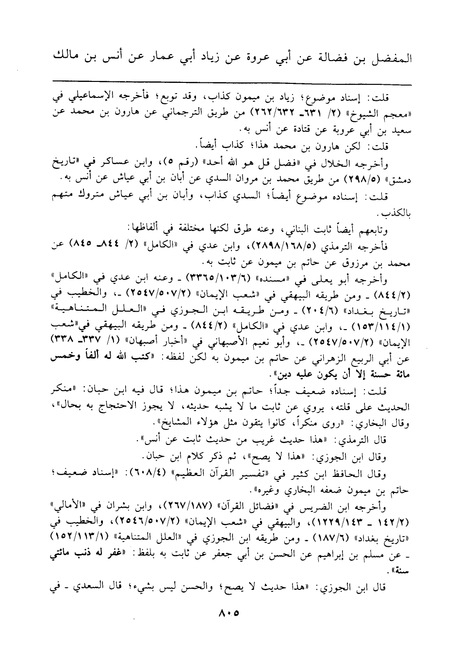 وأخرجه أبو يعلى في "مسنده" (6/ 103/ 3365) -وعنه ابن عدي في "الكامل" (2/ 844) -ومن طريقه البيهقي في "شعب الإيمان" (2/ 507/ 2547) -، والخطيب في "تاريخ بغداد" (6/ 204) -ومن طريقه ابن الجوزي في "العلل المتناهية" (1/ 114/ 153) -، وابن عدي في "الكامل" (2/ 844) -ومن طريقه البيهقي في "شعب الإيمان" (2/ 507/ 2547) -، وأبو نعيم الأصبهاني في "أخبار أصبهان" (1/ 337 - 338) عن أبي الربيع الزهراني عن حاتم بن ميمون به لكن لفظه: "كتب الله له ألفًا وخمس مائة حسنة إلا أن يكون عليه دين".