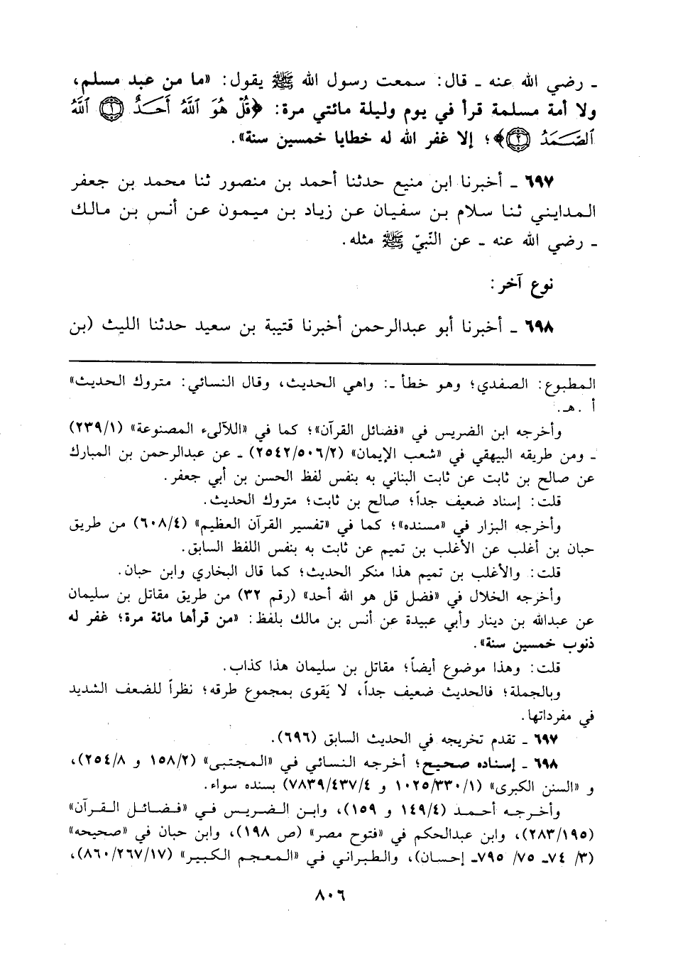 698 - أخبرنا أبو عبد الرحمن أخبرنا قتيبة بن سعيد حدثنا الليث (بن