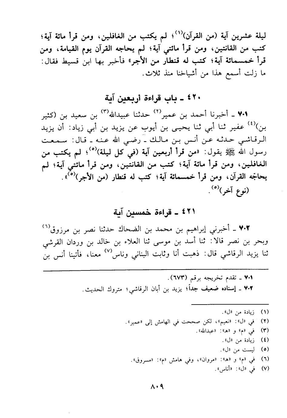 701 - أخبرنا أحمد بن عمير (¬2) حدثنا عبيد الله (¬3) بن سعيد بن (كثير بن) (¬4) عفير ثنا أبي ثنا يحيى بن أيوب عن يزيد بن أبي زياد: أن يزيد الرقاشي حدثه عن أنس بن مالك - رضي الله عنه - قال: سمعت رسول الله - صلى الله عليه وسلم - يقول: "من قرأ أربعين آية (في كل ليلة) (¬5)؛ لم يكتب من الغافلين، ومن قرأ مائة آية؛ كتب من القانتين، ومن قرأ مائتي آية؛ لم يحاجّه القرآن، ومن قرأ خمسمائة آية؛ كتب له قنطار (من الأجر) (5) ".