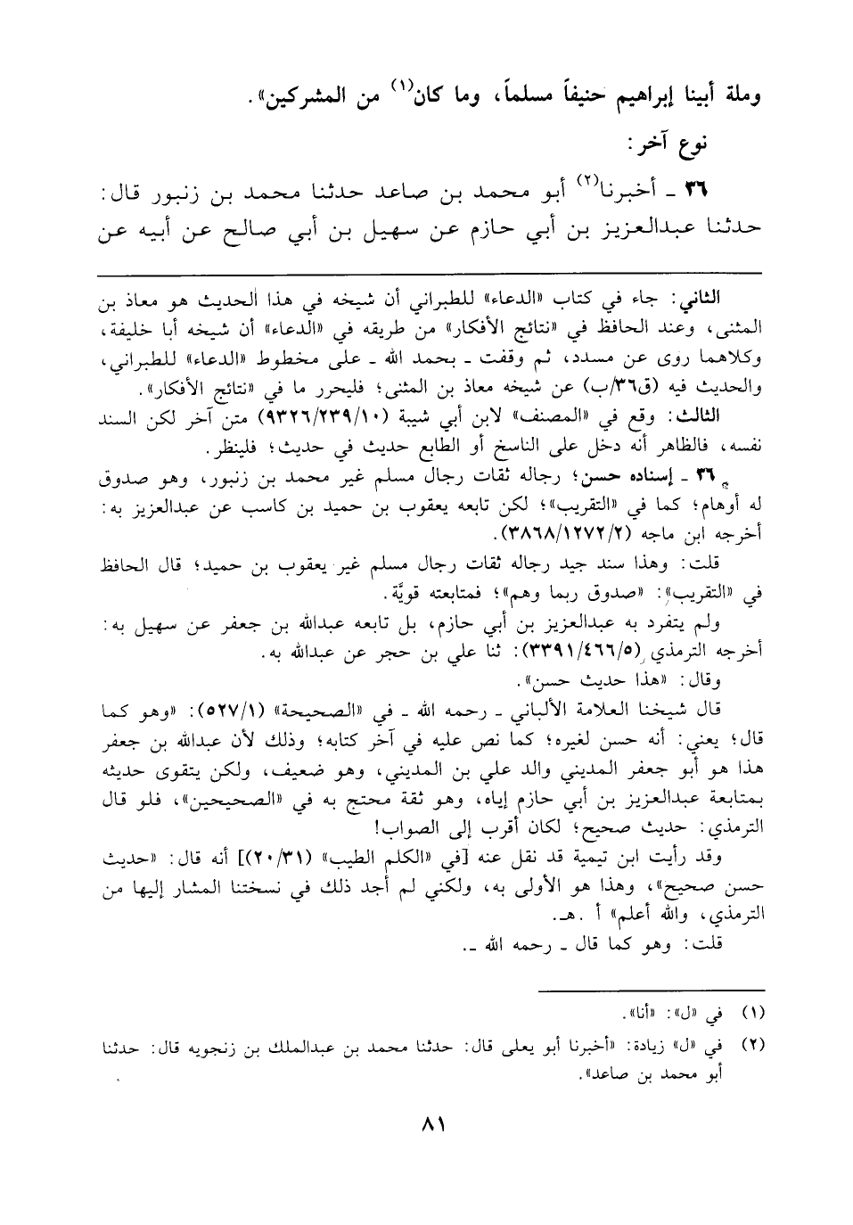 الثاني: جاء في كتاب "الدعاء" للطبراني أن شيخه في هذا الحديث هو معاذ بن المثنى، وعند الحافظ في "نتائج الأفكار" من طريقه في "الدعاء" أن شيخه أبا خليفة، وكلاهما روى عن مسدد، ثم وقفت -بحمد الله- على مخطوط "الدعاء" للطبراني، والحديث فيه (ق 36/ ب) عن شيخه معاذ بن المثنى، فليحرر ما في "نتائج الأفكار".
