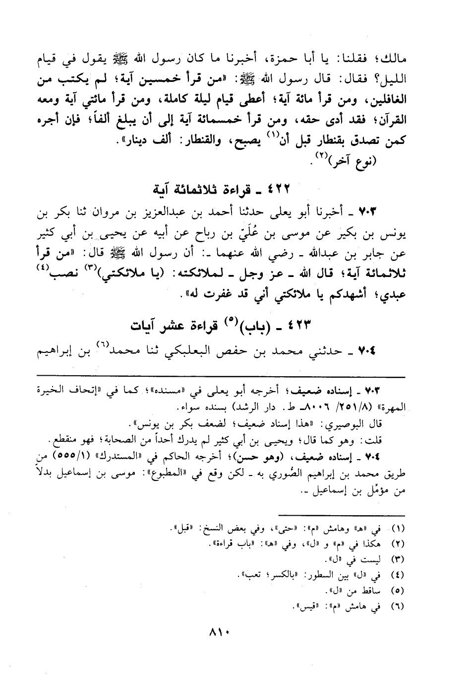 703 - أخبرنا أبو يعلى حدثنا أحمد بن عبد العزيز بن مروان ثنا بكر بن يونس بن بكير عن موسى بن عُلَيّ بن رباح عن أبيه عن يحيى بن أبي كثير عن جابر بن عبد الله - رضي الله عنهما -: أن رسول الله - صلى الله عليه وسلم - قال: "من قرأ ثلاثمائة آية؛ قال الله - عَزَّ وَجَلَّ - لملاتكته: (يا ملائكتي) (¬3) نصب (¬4) عبدي؛ أشهدكم يا ملائكتي أني قد غفرت له".