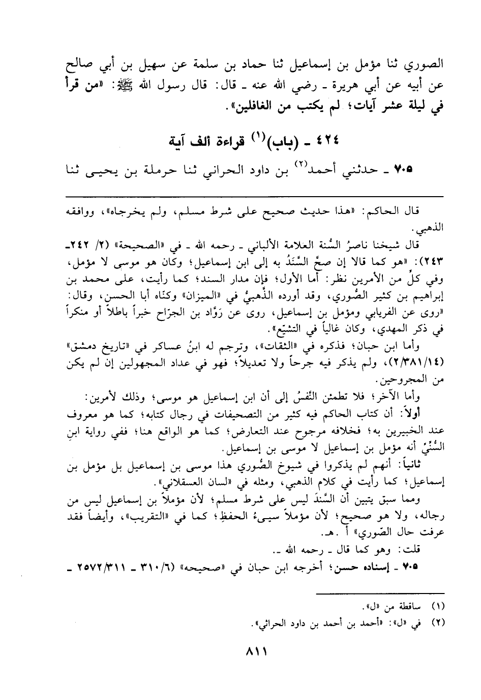 الصوري ثنا مؤمل بن إسماعيل ثنا حماد بن سلمة عن سهيل بن أبي صالح عن أبيه عن أبي هريرة - رضي الله عنه - قال: قال رسول الله - صلى الله عليه وسلم -: "من قرأ في ليلة عشر آيات؛ لم يكتب من الغافلين".