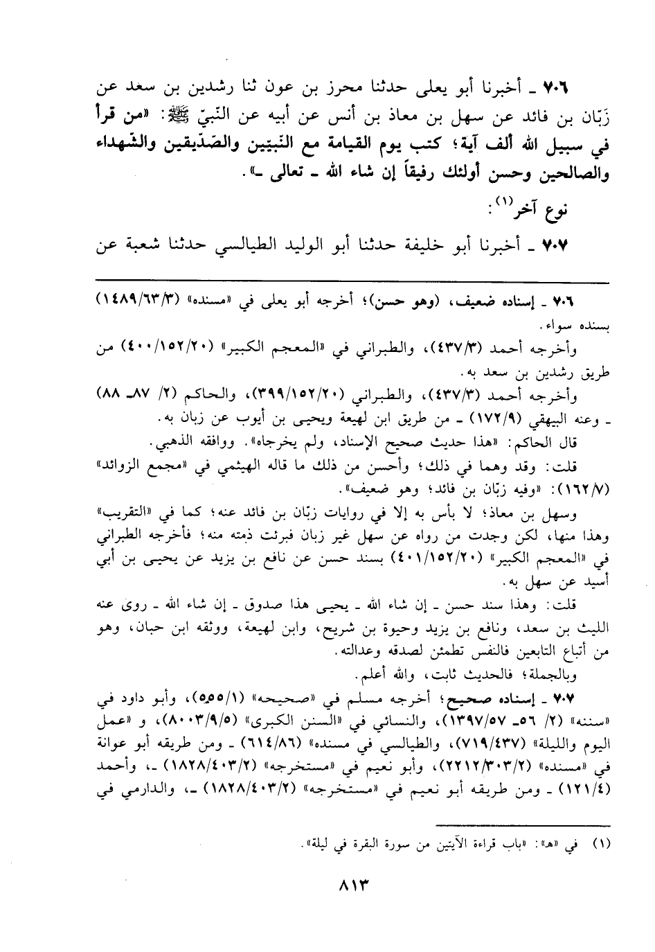 706 - أخبرنا أبو يعلى حدثنا محرز بن عون ثنا رشدين بن سعد عن زَبّان بن فائد عن سهل بن معاذ بن أنس عن أبيه عن النّبيّ - صلى الله عليه وسلم -: "من قرأ في سبيل الله ألف آية؛ كتب يوم القيامة مع النبيين والصّدّيقين والشهداء والصالحين وحسن أولئك رفيقًا إن شاء الله -تعالى-".