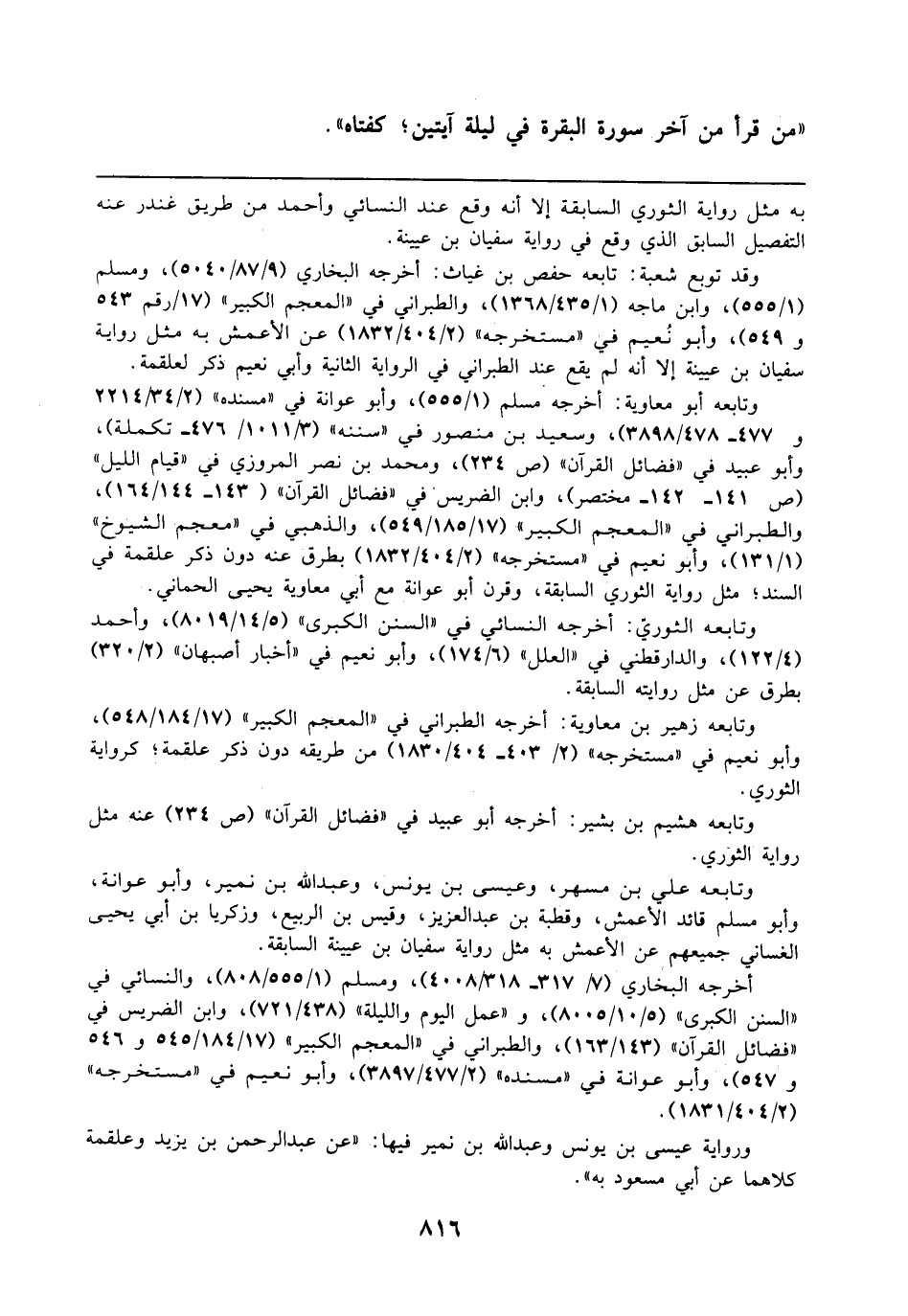 ورواية عيسى بن يونس وعبد الله بن نمير فيها: "عن عبد الرحمن بن يزيد وعلقمة كلاهما عن أبي مسعود به".
