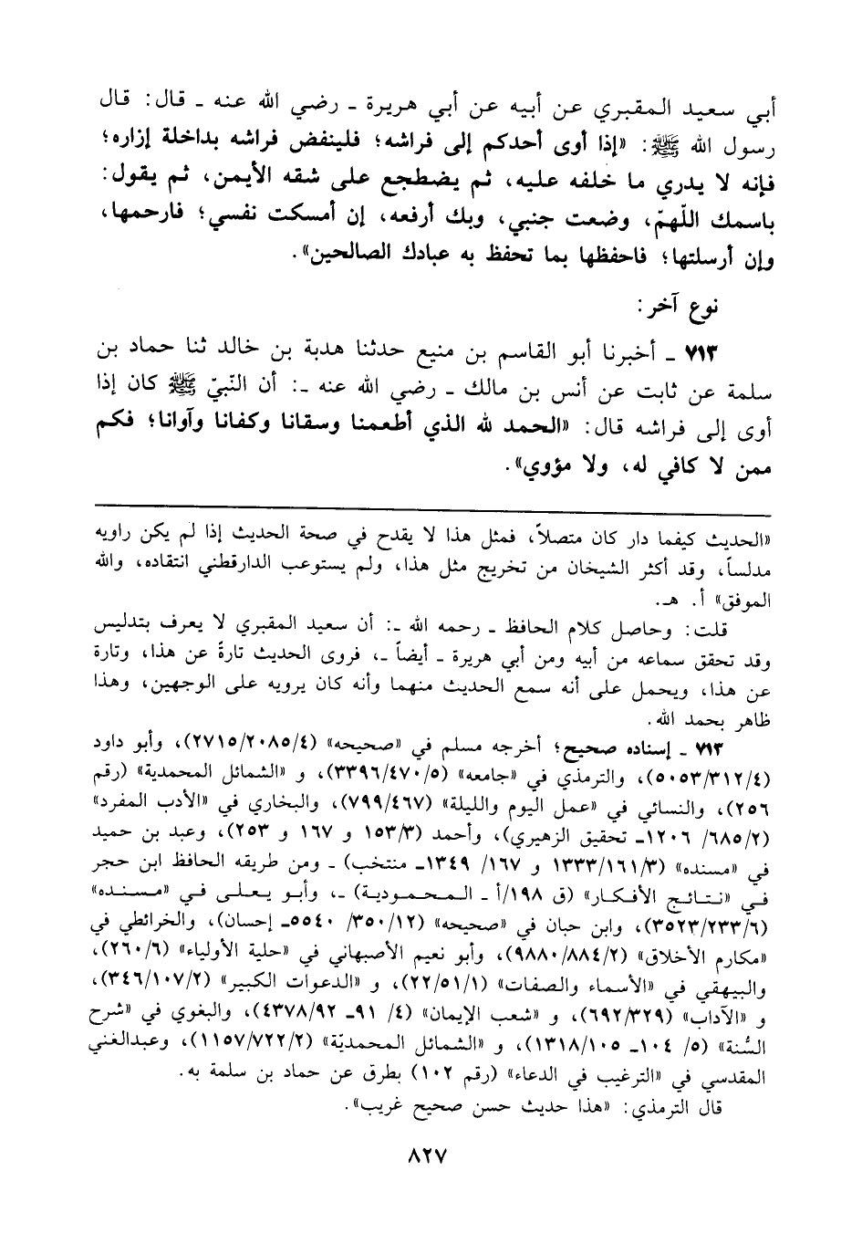 713 - إسناده صحيح؛ أخرجه مسلم في "صحيحه" (4/ 2085/ 2715)، وأبو داود (4/ 312/ 505)، والترمذي في "جامعه" (5/ 470/ 3396) و"الشمائل المحمدية" (رقم 256)، والنسائي في "عمل اليوم والليلة" (467/ 799)، والبخاري في "الأدب المفرد" (2/ 685/ 1206 - تحقيق الزهيري)، وأحمد (3/ 153 و 167 و 253)، وعبد بن حميد في "مسنده" (3/ 161/ 1333 و 167/ 1349 - منتخب) -ومن طريقه الحافظ ابن حجر في "نتائج الأفكار" (ق 198/أ - المحمودية) -، وأبو يعلى في "مسنده" (6/ 233/ 3523)، وابن حبان في "صحيحه" (12/ 350/ 5540 - إحسان)، والخرائطي في "مكارم الأخلاق" (2/ 884/ 9880)، وأبو نعيم الأصبهاني في "حلية الأولياء" (6/ 260)، والبيهقي في "الأسماء والصفات" (1/ 51/ 22)، و"الدعوات الكبير" (2/ 107/ 346)، و"الآداب" (329/ 692)، و"شعب الإيمان" (4/ 91 - 92/ 4378)، والبغوي في "شرح السُّنَّة" (5/ 104 - 105/ 1318)، و"الشمائل المحمدية" (2/ 722/ 1157)، وعبد الغني المقدسي في "الترغيب في الدعاء" (رقم 102) بطرق عن حماد بن سلمة به.