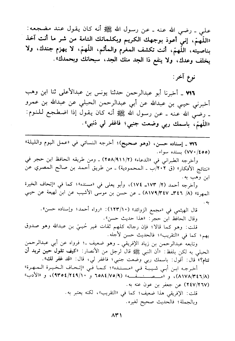 716 - أخبرنا أبو عبد الرحمن حدثنا يونس بن عبد الأعلى ثنا ابن وهب أخبرني حيي بن عبد الله عن أبي عبد الرحمن الحبلي عن عبد الله بن عمرو - رضي الله عنه - عن رسول الله - صلى الله عليه وسلم - أنه كان يقول إذا اضطجع للنوم: "اللهمّ، باسمك ربي وضعت جنبي؛ فاغفر لي ذنبي".