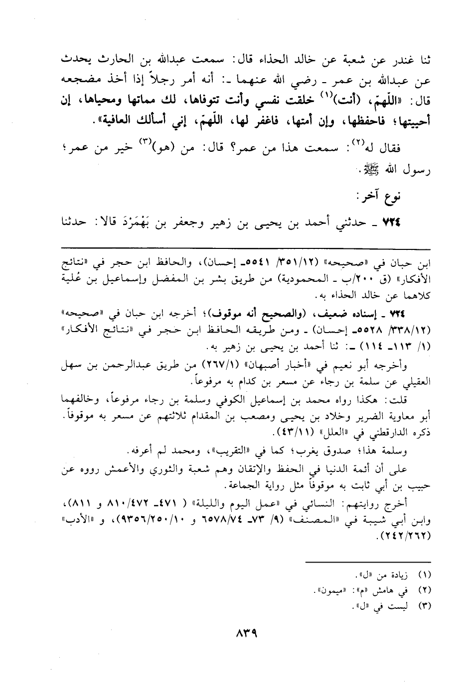 724 - إسناده ضعيف؛ (والصحيح أنه موقوف)؛ أخرجه ابن حبان في "صحيحه" (12/ 338/ 5528 - إحسان) -ومن طريقه الحافظ ابن حجر في "نتائج الأفكار" (1/ 113 - 114) -: ثنا أحمد بن يحيى بن زهير به.