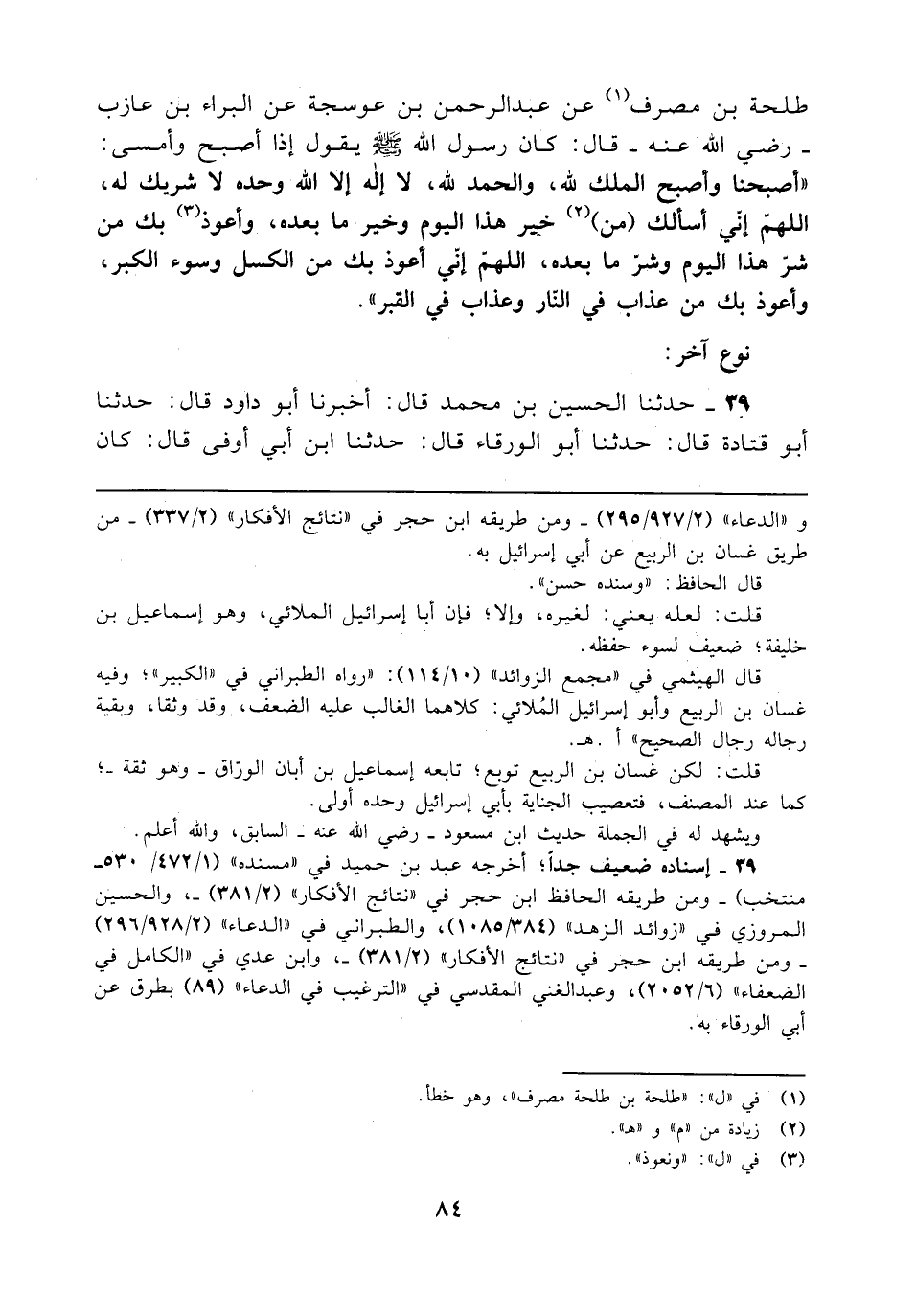 طلحة بن مصرف (¬1) عن عبد الرحمن بن عوسجة عن البراء بن عازب - رضي الله عنه - قال. كان رسول الله - صلى الله عليه وسلم - يقول إذا أصبح وأمسى: "أصبحنا وأصبح الملك لله، والحمد لله، لا إله إلا الله وحده لا شريك له، اللهم إنّي أسألك (من) (¬2) خير هذا اليوم وخير ما بعده، وأعوذ (¬3) بك من شرّ هذا اليوم وشرّ ما بعده، اللهم إنّي أعوذ بك من الكسل وسوء الكبر، وأعوذ بك من عذاب في النار وعذاب في القبر".