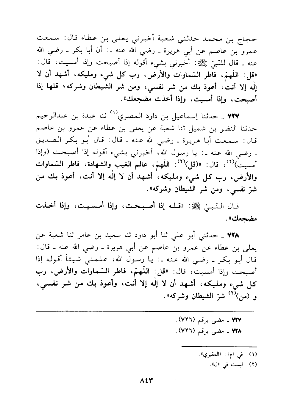 حجاج بن محمد حدثني شعبة أخبرني يعلي بن عطاء قال: سمعت عمرو بن عاصم عن أبي هريرة - رضي الله عنه -: أن أبا بكر - رضي الله عنه - قال للنبي - صلى الله عليه وسلم -: أخبرني بشيء أقوله إذا أصبحت وإذا أمسيت، قال: "قل: اللهمّ، فاطر السّماوات والأرض، رب كل شيء ومليكه، أشهد أن لا إله إلا أنت، أعوذ بك من شر نفسي، ومن شر الشيطان وشركه؛ قلها إذا أصبحت، وإذا أمسيت، وإذا أخذت مضجعك".