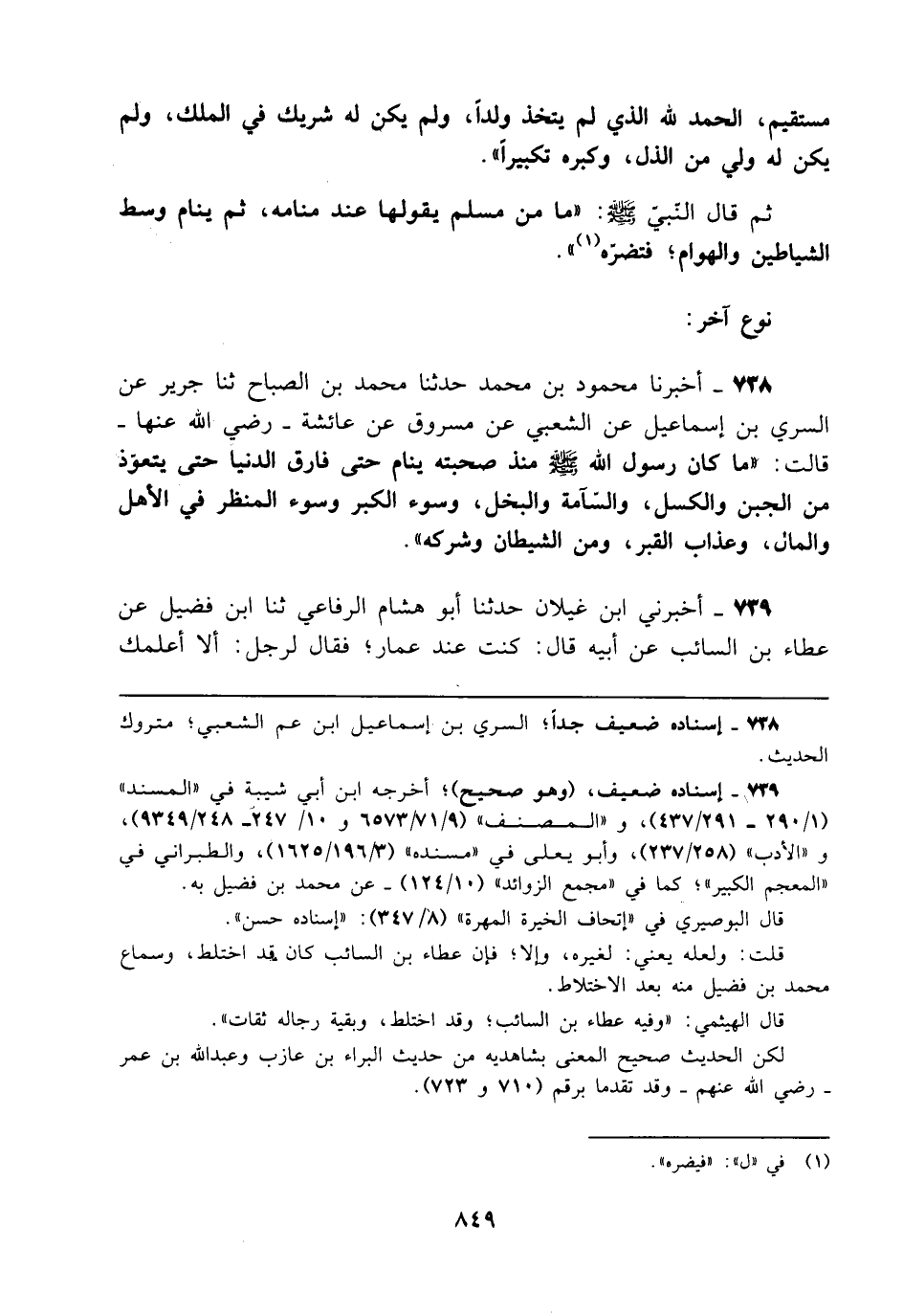 738 - أخبرنا محمود بن محمد حدثنا محمد بن الصباح ثنا جرير عن السري بن إسماعيل عن الشعبي عن مسروق عن عائشة - رضي الله عنها - قالت: "ما كان رسول الله - صلى الله عليه وسلم - منذ صحبته ينام حتى فارق الدنيا حتى يتعوّذ من الجبن والكسل، والسّآمة والبخل، وسوء الكبر وسوء المنظر في الأهل والمال، وعذاب القبر، ومن الشيطان وشركه".