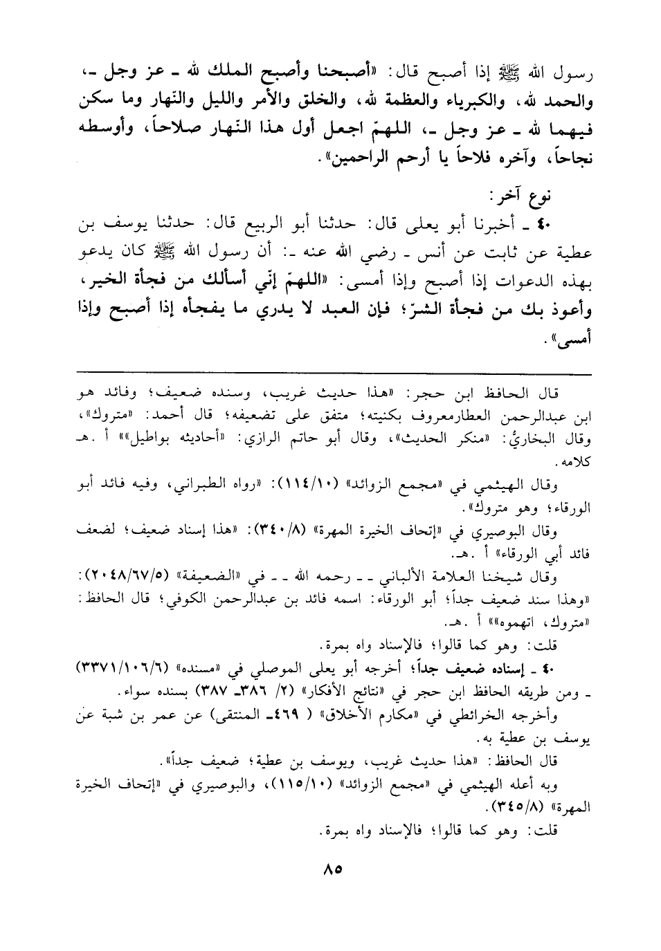 40 - أخبرنا أبو يعلى قال: حدثنا أبو الربيع قال: حدثنا يوسف بن عطية عن ثابت عن أنس - رضي الله عنه -: أن رسول الله - صلى الله عليه وسلم - كان يدعو بهذه الدعوات إذا أصبح وإذا أمسى: "اللهمّ إنّي أسألك من فجأة الخير، وأعوذ بك من فجأة الشر؛ فإن العبد لا يدري ما يفجأه إذا أصبح وإذا أمسى".